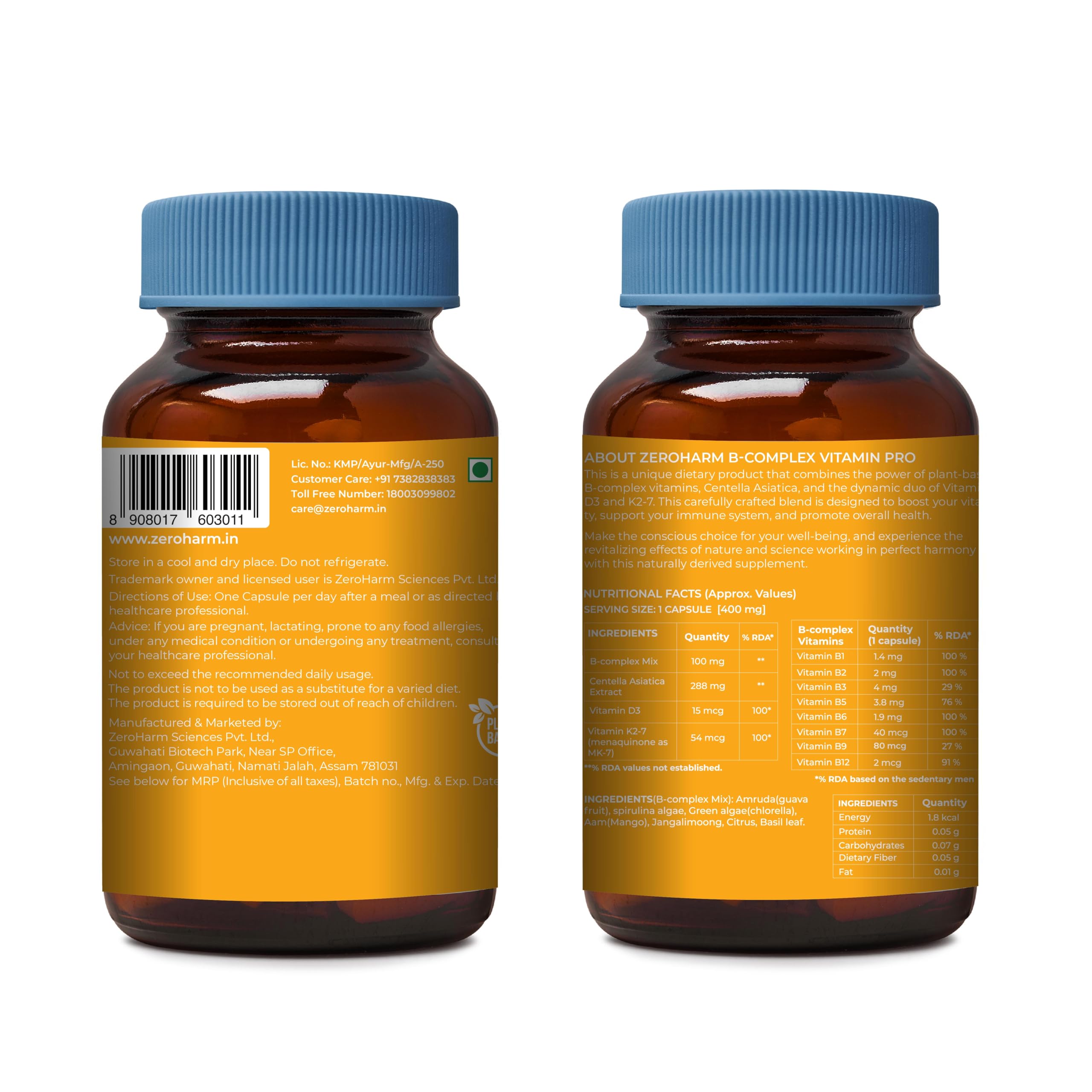 Zeroharm B-Complex Pro with Vitamin D3 & K2-7 | Vitamin B-Complex With B1 B2 B3 B5 B6 B9 & Vit B12 | Plant-Based Supplement | Supports Energy & Immunity For Men and Women | 60 Veg Capsules