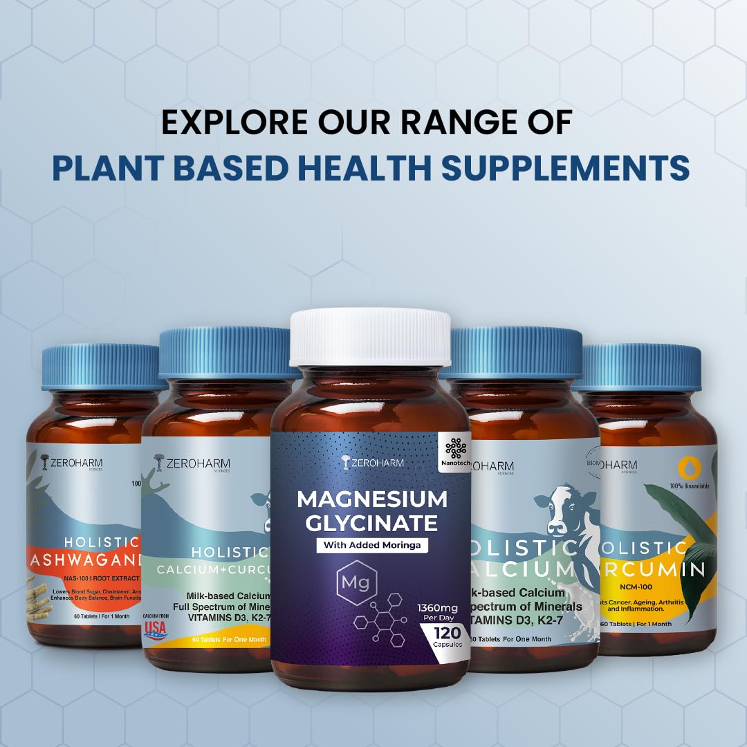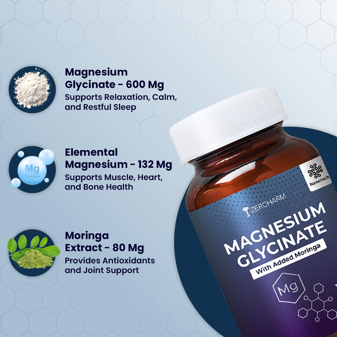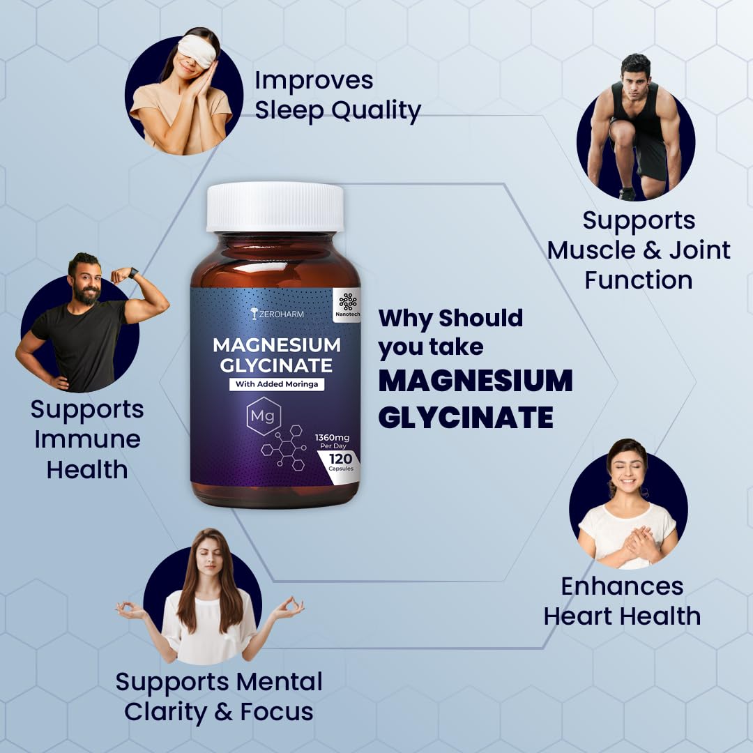 ZeroHarm Magnesium Glycinate 120 Capsules |1360mg Magnesium Supplements for Muscle Support & Nerve function | Regulate blood sugar levels & Blood pressure| Improves sleep cycle | Promotes Brain health