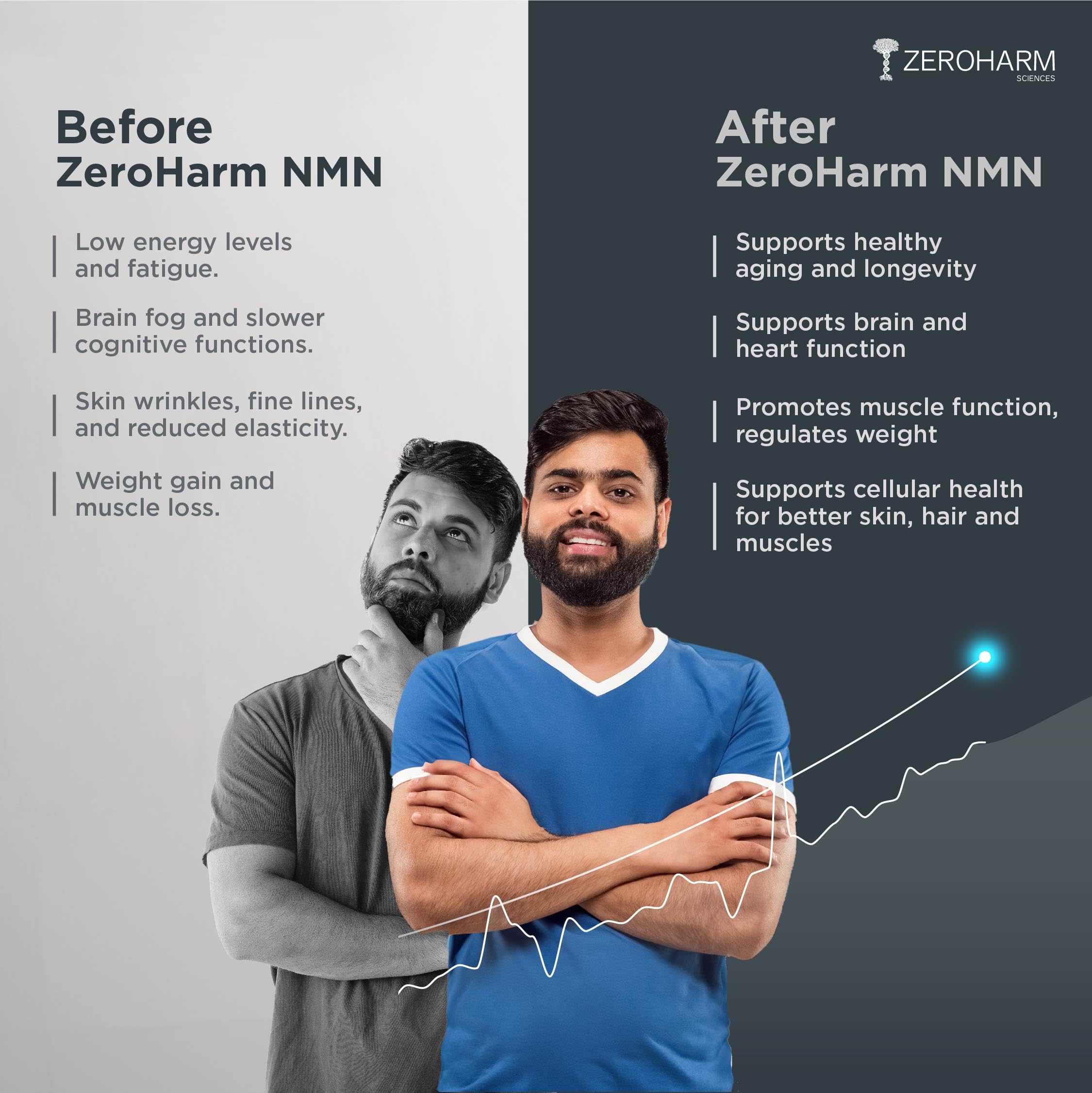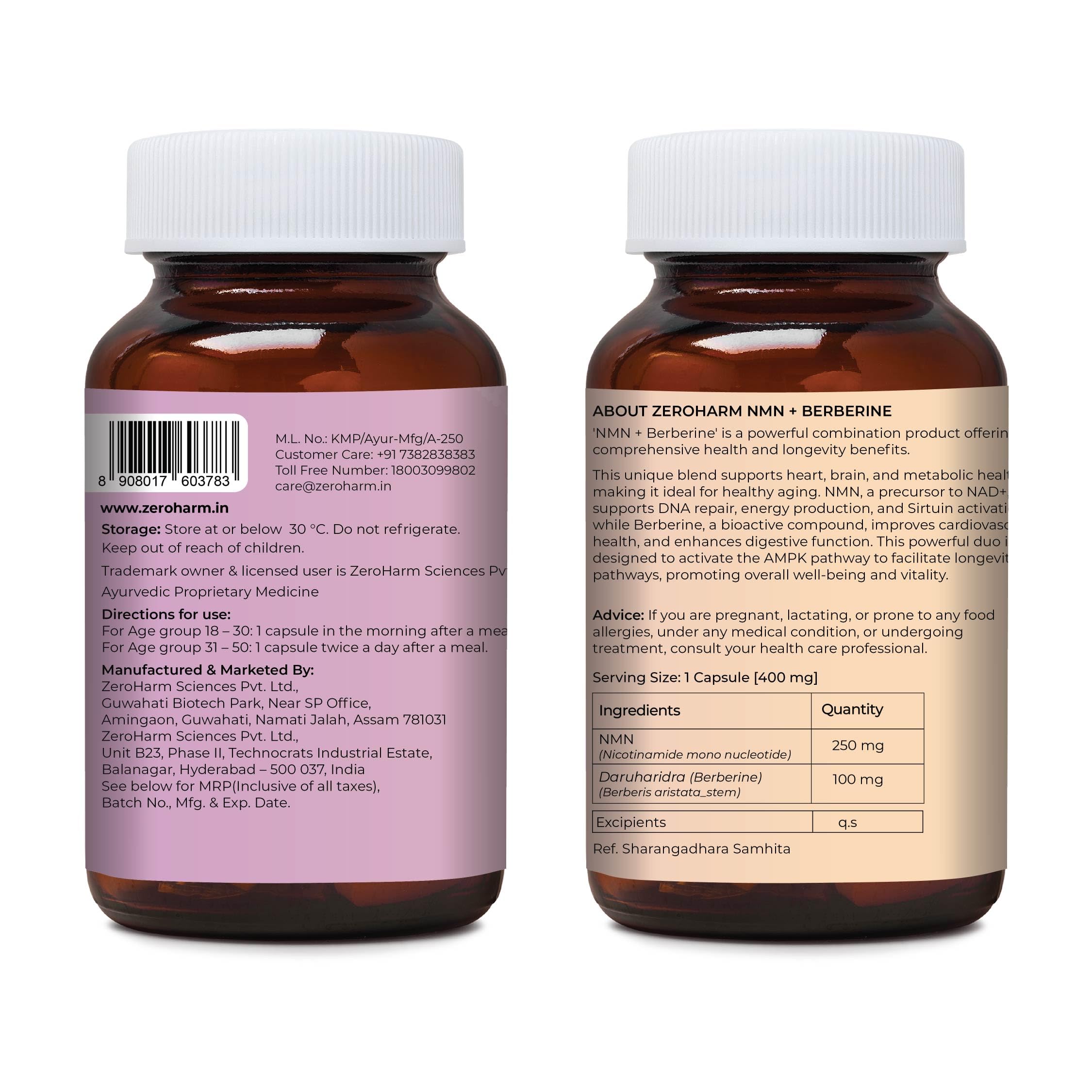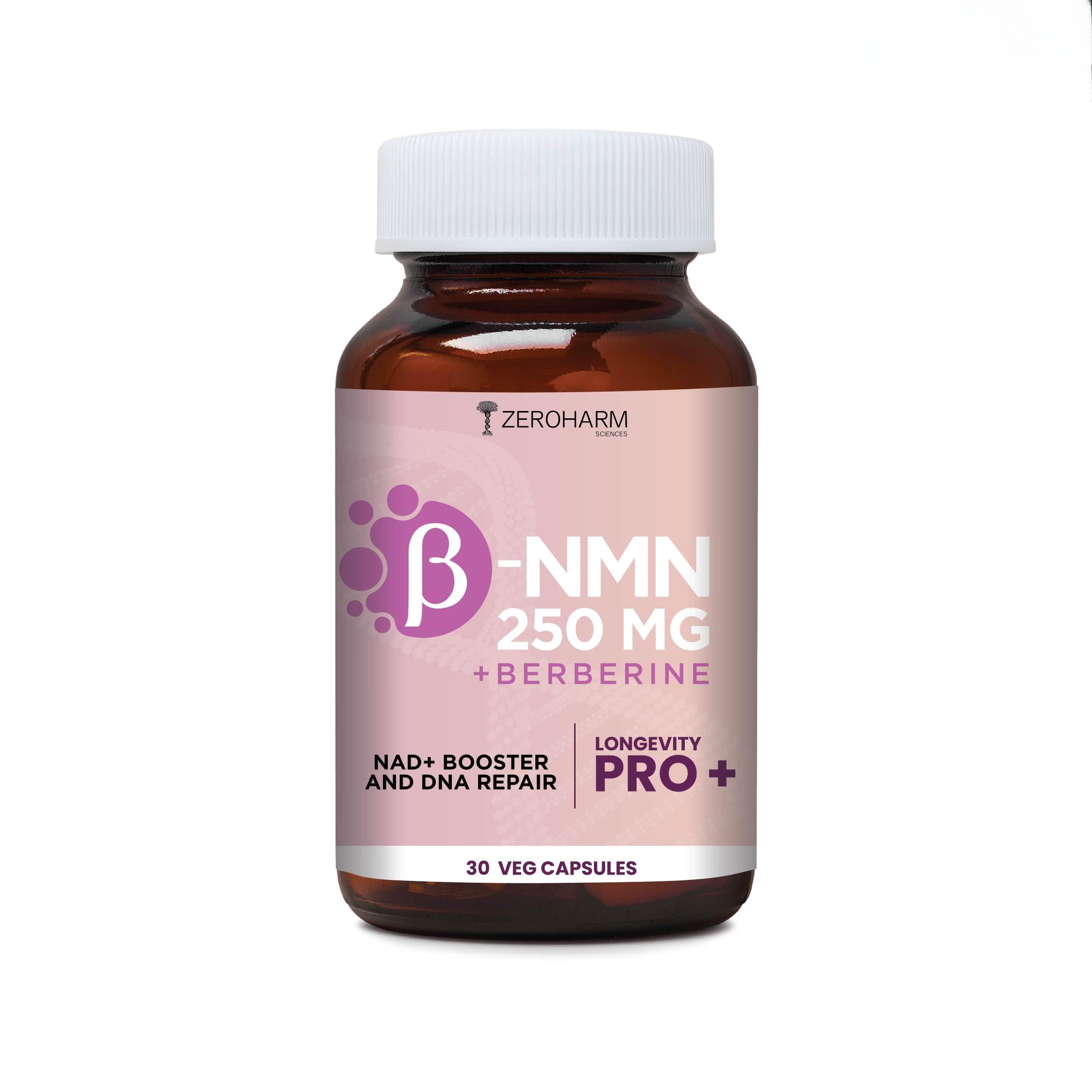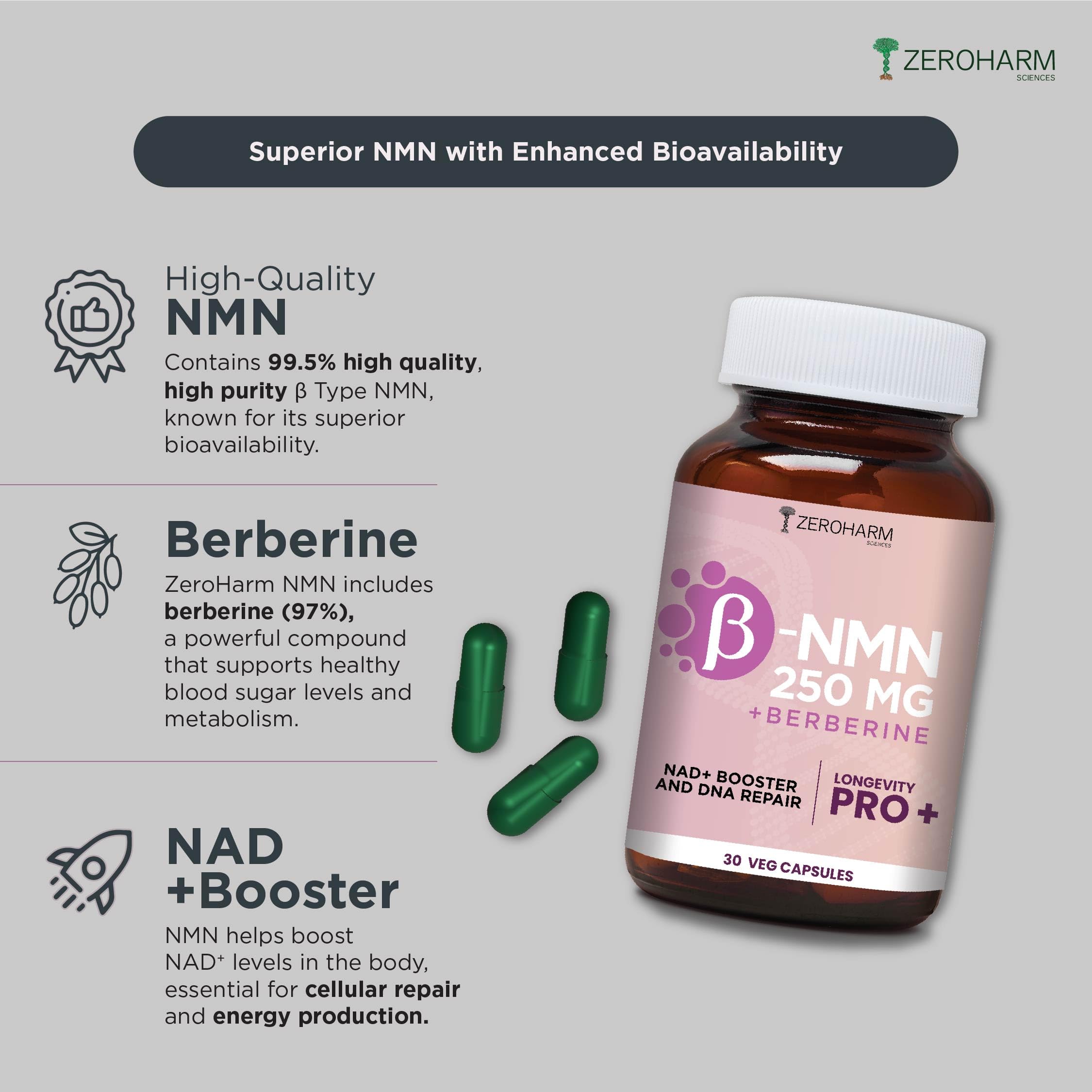 ZEROHARM NMN 250 MG + Berberine Capsules | Longevity Supplement | 99.5% Pure NMN | Boosts Energy Focus & Cellular Health | Healthy Ageing | NAD+ Booster | 30 Capsules | For Men & Women