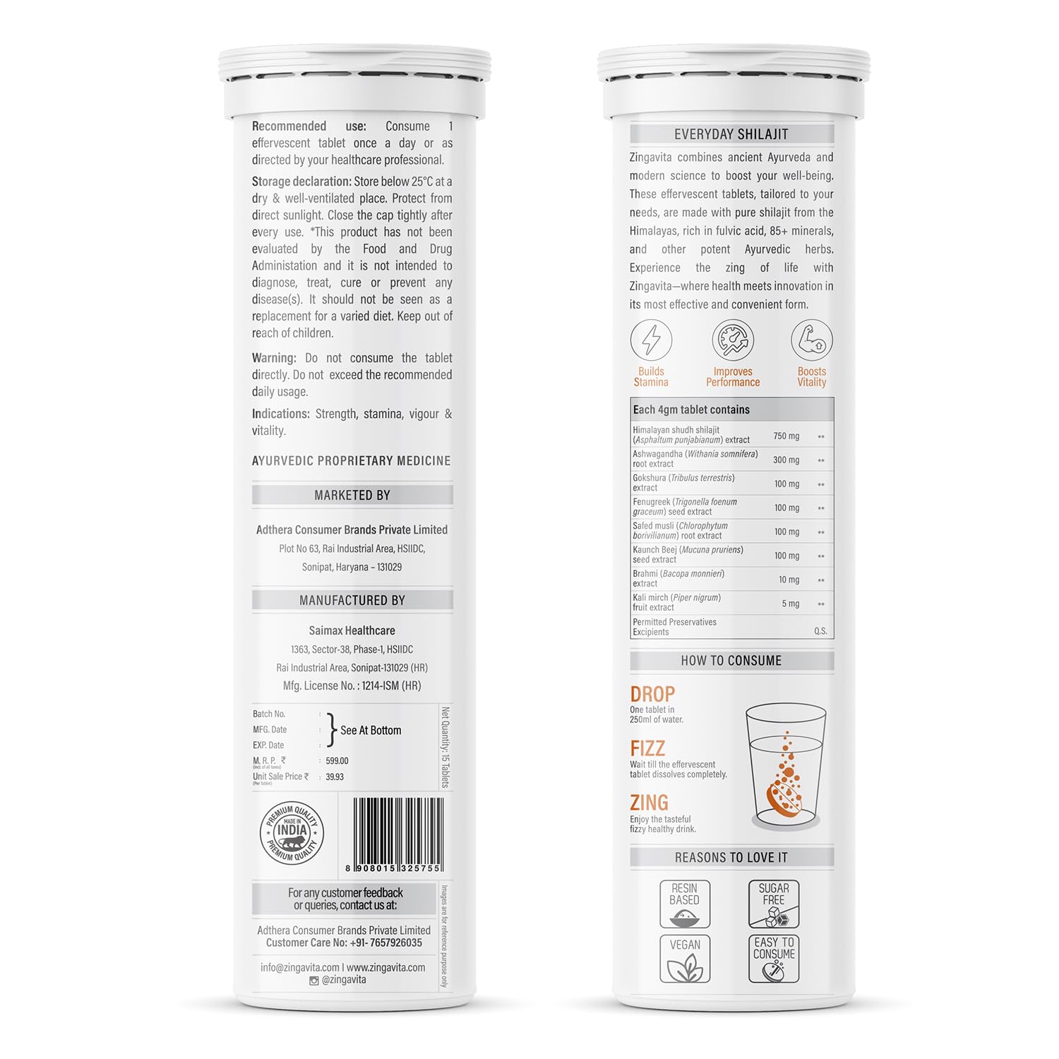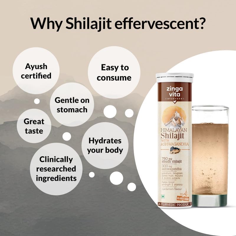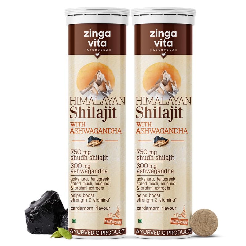 Zingavita Himalayan Shilajit Original (750mg) Effervescent Tablets With Ashwagandha Gokshura & Safed Musli for Strength Performance & Muscle recovery Cardamom Flavour | Ayush Approved | Pack of 2