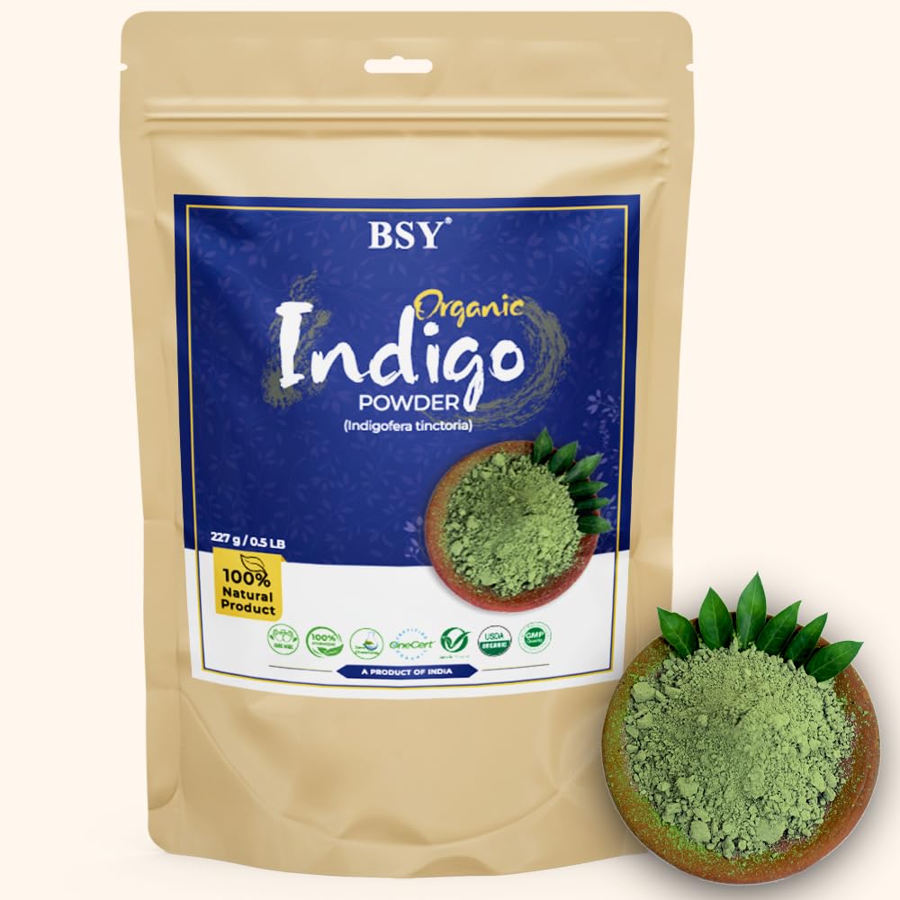 Organic Indigo Powder Enjoy the benefits of BSY organic Indigo powder which offers a permanent and vibrant rich hair color without the use of any harmful chemicals. When used with henna powder it provides a black and brown hair colour.