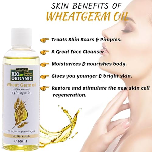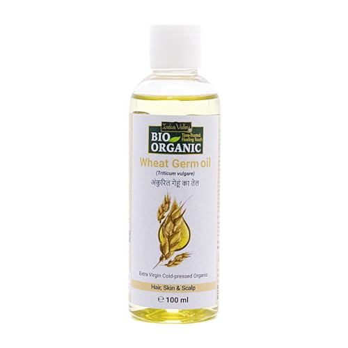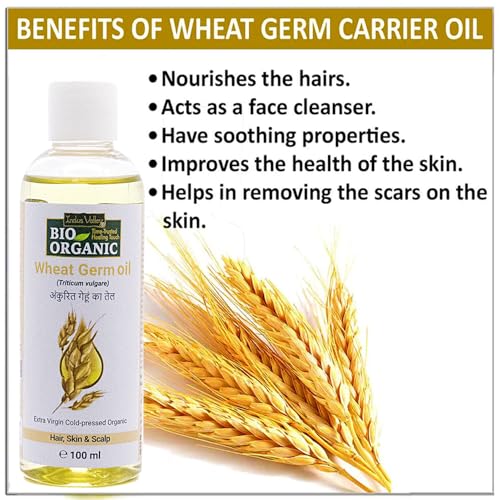 INDUS VALLEY BIO ORGANIC Cold Pressed Wheat germs Carrier Oil - 100% Pure and Natural- Suitable for All Skin Types Pure Oil Use for Hair Care Skin Care (100ml) With INDUS VALLEY BIO ORGANIC Cold Pressed Wheat Germ Carrier Oil your ideal beauty partner you can truly experience the essence of nature. This is Pure and Natural oil is extracted using a rigorous cold-press method that preserves all of the nutritional advantages of wheat germ guaranteeing unmatched quality and efficacy. This multifunctional marvel which is made to suit all skin types is an effective supplement for skin and hair care routines. It deeply hydrates revitalizes and renews your skin leaving it soft luminous and youthful. It is enhanced with vitamins minerals and antioxidants. Savor the nourishing qualities of this pure oil for hair that radiates health and energy. In addition to calming and preventing dryness and dandruff nourish your hair from the inside out giving it strength gloss and manageability.