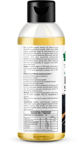 Bliss of Earthorganic Kalonji Oil (Black Cumin Seed Oil) is a premium quality 100% pure 100% organic unrefined virgin & cold pressedoil. It is extracted from the seeds of organic black cumin. It is a rich source of essential fatty acids and also contains two very powerful compoundsNigellone an anti-histamineandThymoquinone an anti-inflammatoryalong with other nutrients that work synergistically to support the body's various functions. Suggested Use:For adults take 1-2 TSP daily with food or your favourite juice. If using for the first time start with o½ TSP and gradually increase over a few days. Regular Use of Black seed promotes: Healthy Inflammatory response. Skin & Hair Health Digestive & respiratory health Healthy blood cholesterol levels Healthy blood pressure levels Healthy blood sugar levels
