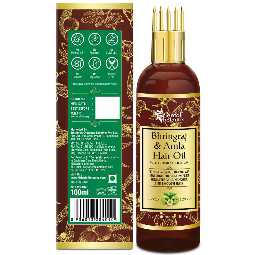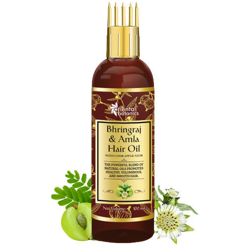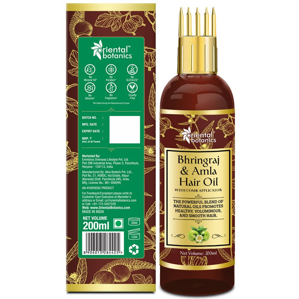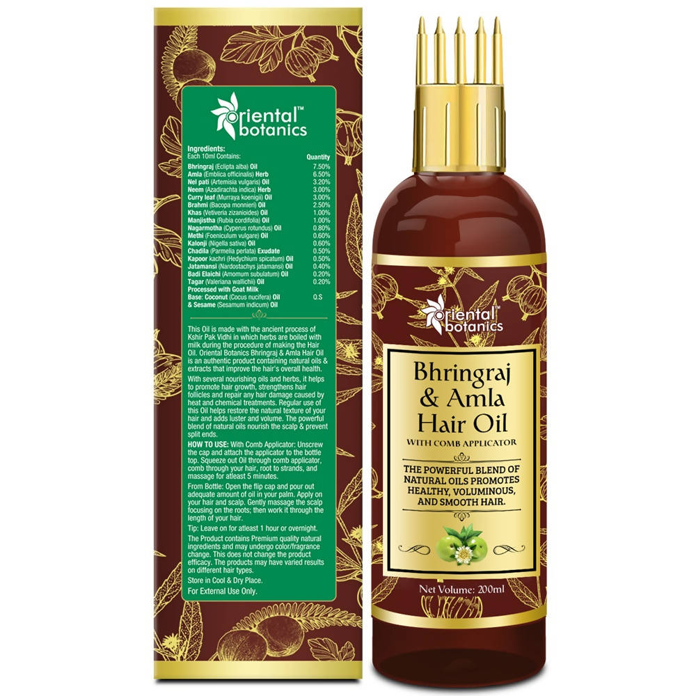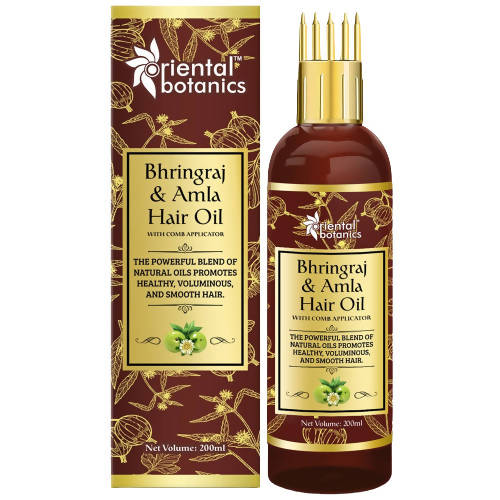 Oriental Botanics Bhringraj & Amla Hair Oil With Comb Applicator: 100 ml, 200 mlMassaging your hair and scalp with the goodness of natural ingredients is the perfect way to deliver the required nutrients to your strands. Bhringraj & Amla Hair Oil comes packed with everything essential for better health & strength of your mane. Formulated without harmful chemicals, it is safe to be used in the long run.Ingredients:Bhringraj Bhringraj promotes healthy hair growth by strengthening the strands.Amla Amla contains phytonutrients that stimulate hair growth and breakage.Neem Neem helps dry and itchy scalp and keeps it fresh and healthy.Brahmi Brahmi helps reduce scalp problems and irritations. It promotes healthier & stronger hair.Manjishtha Manjishtha helps greying of hair and keeps excessive dryness at bay.Goat Milk It is made using the ancient Kshir Pak Vidhi where the herbs are boiled using goat milk.How To Use:Take the required amount of oil onto your palms and massage gently on your hair and scalp. Let the oil sit overnight for best results. Wash it off with Oriental Botanics Bhringraj & Amla Shampoo.Legal Disclaimer: The product is guaranteed to be 100% genuine. Product images are for illustrative purposes onl