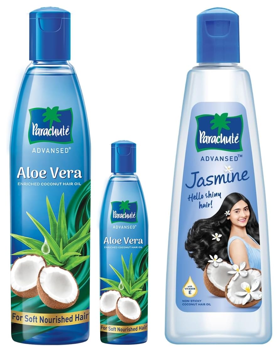 Parachute Advansed Jasmine Coconut Hair Oil With Vitamin-E For Healthy Shiny Hair Non-sticky 300mlIt's time for your hair to take the spotlight and bring out its shine with Parachute Advansed Jasmine Hair Oil! It's an amazing blend of 2 super potent ingredients - Coconut oil and Vitamin E. It not only nourishes hair but leaves it soft silky and shiny. Coconut oil for hair is the best as it can penetrate 10x deeper into hair and nourish it from within while Vitamin E increases hair strength and brings out the shine alive. What's more it's so light and non-sticky that it's a perfect hair oil for women and men as it's easy to apply on your hair after a hair-wash and style it the way you want. It's loaded with Jasmine extracts that leaves a soothing and refreshing fragrance all day long. For best results apply Parachute Advanced Jasmine coconut hair oil at least 3 times in a week to get the shine that your hair deserves !!! Directions to Use: Take enough oil on your palm. Gently massage on the hair from root to tip. Leave it on for 30-45 mins for the shine that your hair deserves.Parachute Advansed Aloe Vera Enriched Coconut Hair Oil 250ml + 75ml | For Soft Strong HairPresenting Parachute Advansed Aloe Vera Coconut enriched Hair Oil for the first time ever the miracle combination of pure Coconut oil and Aloe Vera extracts that makes your hair so soft that you can't stop touching it. Aloe Vera is known to deeply condition and moisturize hair from within while coconut oil penetrates 10X deeper and provides nourishment from root to tip making hair long and strong. This heavenly combination of goodness of Aloe Vera gel extracts and Pure Coconut oil provides a long-term solution to prevent frizzy dull and dry hair. It's a must-have in your weekly hair-care routine for hair for that is so soft. For best results apply Parachute Advanced Aloe Vera hair oil in the night and wash it off in the morning. It gives oil the time to go deep into the roots and nourish your hair from within. It's light and non-sticky and suitable for all hair types. You can also lightly apply pea-sized amount of this oil post hair-wash for conditioned and manageable hair look all day long thereby enabling you to style your hair any way you want to.