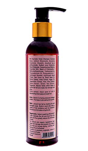 Him Ayurveda Onion Shampoo Contains Onion Black Seed Oil Brahmi; Amla; Methi; Argan Oil Nagarmotha Aloe Vera Neem ExtractGreen Tea Extract Natural Herbs which helps to control hair fall and make hair stronger and shiny.