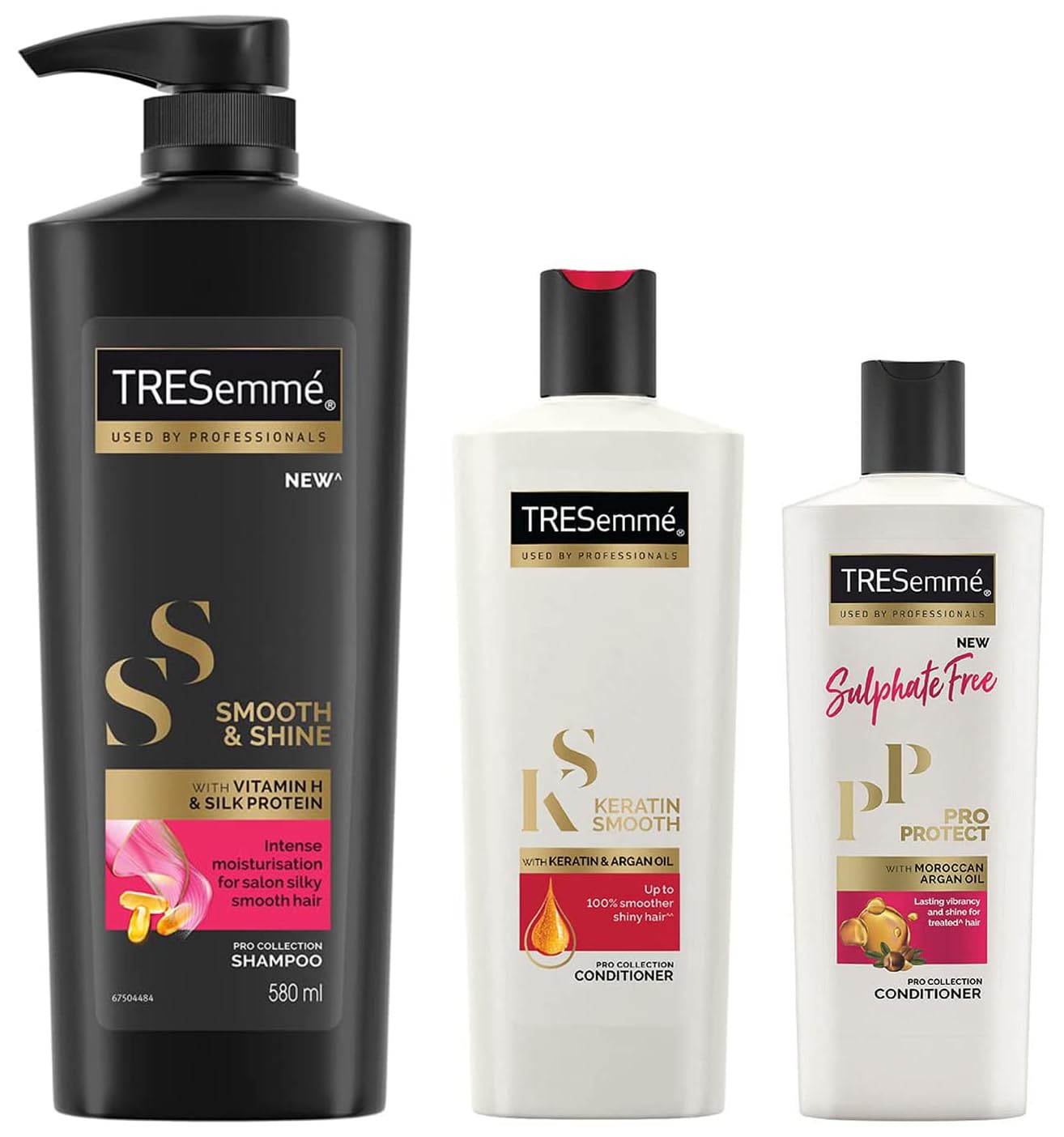 TRESemme Smooth & Shine Shampoo 580 ml with Biotin & Silk Proteins for Silky Smooth Hair Moisturises Dry & Frizzy Hair Mild Shampoo for Women & MenTRESemmé Smooth & Shine Shampoo provides intense moisturization to your hair giving you salon silky smooth hair. Enriched with Vitamin H and Silk Protein this professional shampoo has patented micro-moisture technology that protects dry hair from damage. Vitamin H which is also known as Biotin plays an important role in maintaining the health of your hair while Silk Protein helps in moisturizing hair and improving its elasticity. This salon quality shampoo has an advanced smoothing system which is enriched with Moroccan Argan oil. It is light enough for daily use. It is great for frizzy hair too. It controls frizz and flyaways without weighing your hair down to give you hair that feels detangled more manageable as well as softer and smoother. This moisturizing shampoo cleanses and helps tame unruly hair leaving your hair smooth and salon-soft. It is especially formulated for Indian hair and is suitable for use in conjunction with oil treatments. For best results use with the TRESemmé Smooth & Shine Conditioner. Buy now to make your tresses smoother shinier and easy to style! Suitable for both men and women. To use: Apply gently to wet hair and work into a lather.Rinse thoroughly. For an extra boost of shine follow with TRESemmé Smooth & Shine Conditioner.TRESemme Keratin Smooth Conditioner 335 ml With Keratin & Argan Oil for Straight Shiny Hair - Nourishes Dry Hair & Controls Frizz For Men & WomenDeep condition your hair and protect them from damage to get smoother hair with the TRESemmé Keratin Smooth Conditioner. With its lower sulfate formulation it helps restore keratin in your hair and nourishes its every strand to leave your hair straighter and shinier. Infused with Keratin and light-weight Argan oil this nourishing conditioner can make your hair visibly straight and smoother. The Keratin-Argan Oil formulation conditions and strengthens your hair as well as provides them the hydration and elasticity that they need. With its dual action TRESemmé Keratin Smooth professional conditioner can make your hair up to 100% smoother and give them extra shine. It is suitable for use for both naturally and chemically treated hair. When used together with the TRESemmé Keratin Smooth Shampoo it controls frizz for up to 3 amazing days helping you tame your frizz and giving you silky smooth hair. So say no to frizzy hair and say yes to gorgeous salon smooth hair without the salon price tag! Suitable for both men & women. To use: After shampoo apply an adequate amount of TRESemmé Keratin Smooth Conditioner from mid-lengths to the ends. Leave it on for 2-3 minutes and let it work its magic. Rinse your hair thoroughly with lukewarm water. For best results use with TRESemmé Keratin Smooth Shampoo.TRESemme Pro Protect Sulphate Free Conditioner 190 mlLaunched in 1948 TRESemmé was named after renowned hair care expert Edna Emmé. Up until the 1950s TRESemmé was sold only in salons. Today it is available at a shop near you so that you can have salon-style hair at home. For over 60 years TRESemmé has built a history of success in thirteen countries around the world. From its origins in 1947 and salon expertise TRESemmé has been driven by a simple truth: Every woman deserves to look and feel fabulous like she has just stepped out of the salon everyday. This range has also been carefully selected for its advanced formula. TRESemmé Pro Protect Shampoo is the first sulphate-free variant which is infused with the goodness of Moroccan Argan Oil. It is highly beneficial for people having coloured hair because it helps in retaining hair colour along with lending a long-lasting vibrancy and shine to the hair. For best results use it with TRESemmé Pro Protect Conditioner.