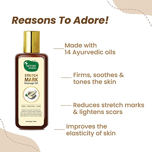 Mother Sparsh massage oil is a blend of selected herbs and oils that helps to reduce appearance of stretch marks and scars by hydrating dry skin deeply. Â It deliver the highest level of moisture.