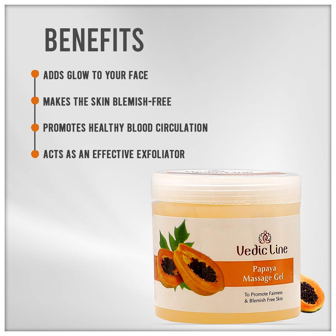 • With goodness of papaya fruits extract aloe Barbadensis leaf juice this vedicline massage gel delaying the ageing by nourish the skin due to its strong anticontent.