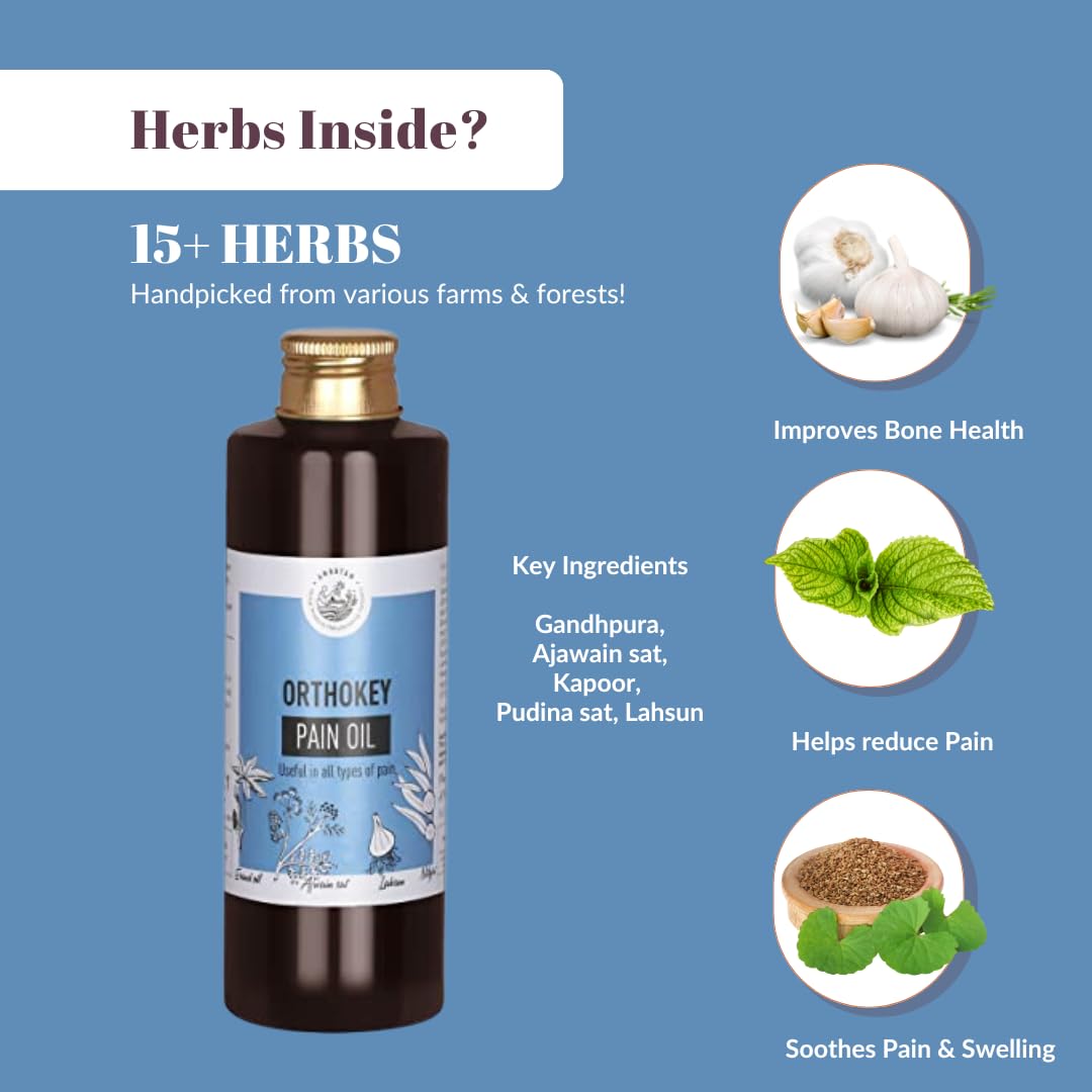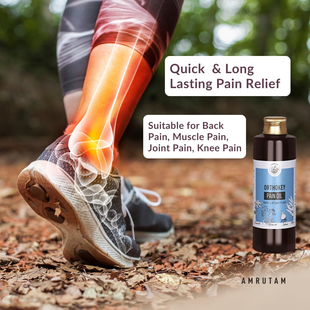 Experience the soothing power of Ayurveda with Orthokey Pain Oil. Crafted with a potent blend of 100% natural ingredients this oil offers rapid and long-lasting relief from a wide range of aches and pains. From muscle strains and backaches to joint discomfort and inflammation Orthokey delivers targeted comfort without harsh chemicals. Orthokey Ayurvedic Massage Pain oil is made using 25 years old recipe & is enriched with a blend of potent and natural ingredients known for their pain-relieving properties. Whether you suffer from joint discomfort or nerve pain this massage oil can provide you with the relief you seek. Recommended for individuals who experience various types of joint pain nerve pain muscle discomfort or general body pain. It can be used by people seeking natural and effective relief from these issues. However as with any topical product it's essential to perform a patch test before widespread application especially if you have sensitive skin or known allergies.