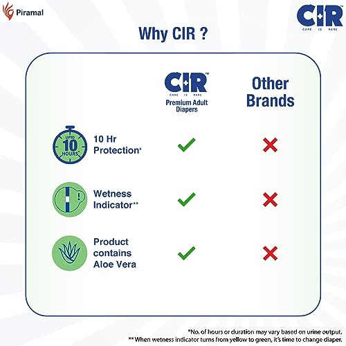CIR Premium Adult Diapers are an effective solution to incontinence for your loved ones. Made of soft & breatheable fabric that has quick absorption CIR Premium Adult Diapers also have a refastenable tape at the waist for easy adjustments & maximum comfort. Also equipped with a wetness indicator for convienient usage. The diapers also have thigh cuffs to prevent any kind of spillage. Enriched with the goodness of Aloe Vera for smooth & clean skin. Discontinue use in case of any irritation.