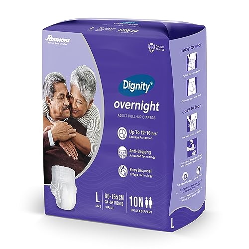 • Dignity Overnight Pull-Up Adult Diapers are underwear style diapers designed for involuntary urination or defecation in both men & women. Overnight Pull-Ups provide Protection for up to 12-16 hours.