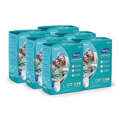 Dignity Premium Pull Up Adult Diapers Pant Style - 60 Count (Large) with Soft Elastic and Extra Absorbent Core, Waist Size 34" - 59", 10 Pcs/Pack (Pack of 6)
