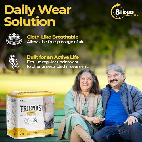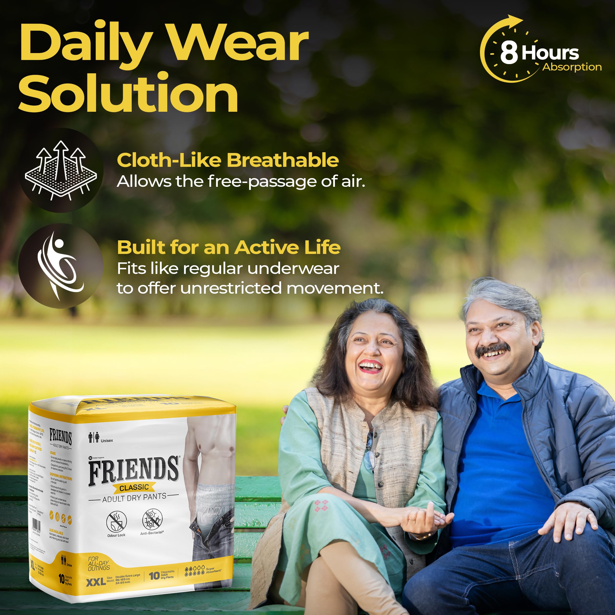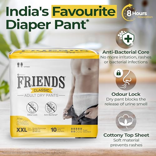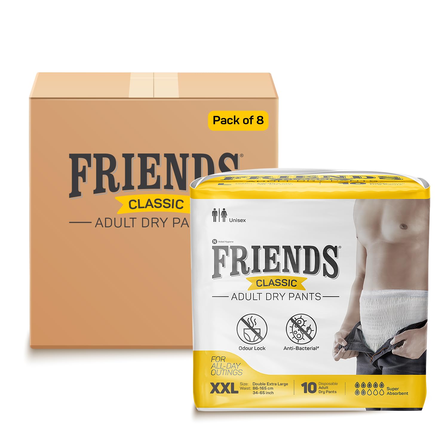 Friends Classic Adult Diapers Pants Style - 80 Count (Double Extra Large) with odour lock, Unisex, Leakproof, Elastic Waist and Anti-Bacterial Absorbent Core - Waist Size 34-65 Inch; 86-165 cm