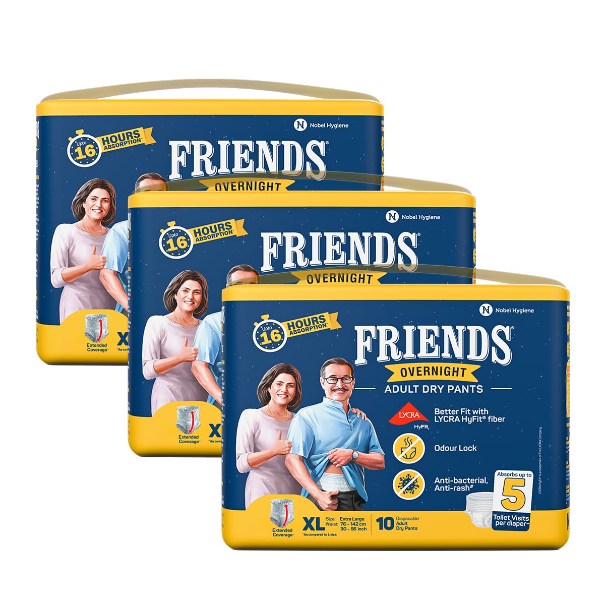Friends Overnight Adult Diapers Pants Style - 30 Count (Extra Large) with odour lock, Unisex, Leakproof, Elastic Waist and Anti-Bacterial Absorbent Core - Waist Size 30-56 Inch; 76-142 cm
