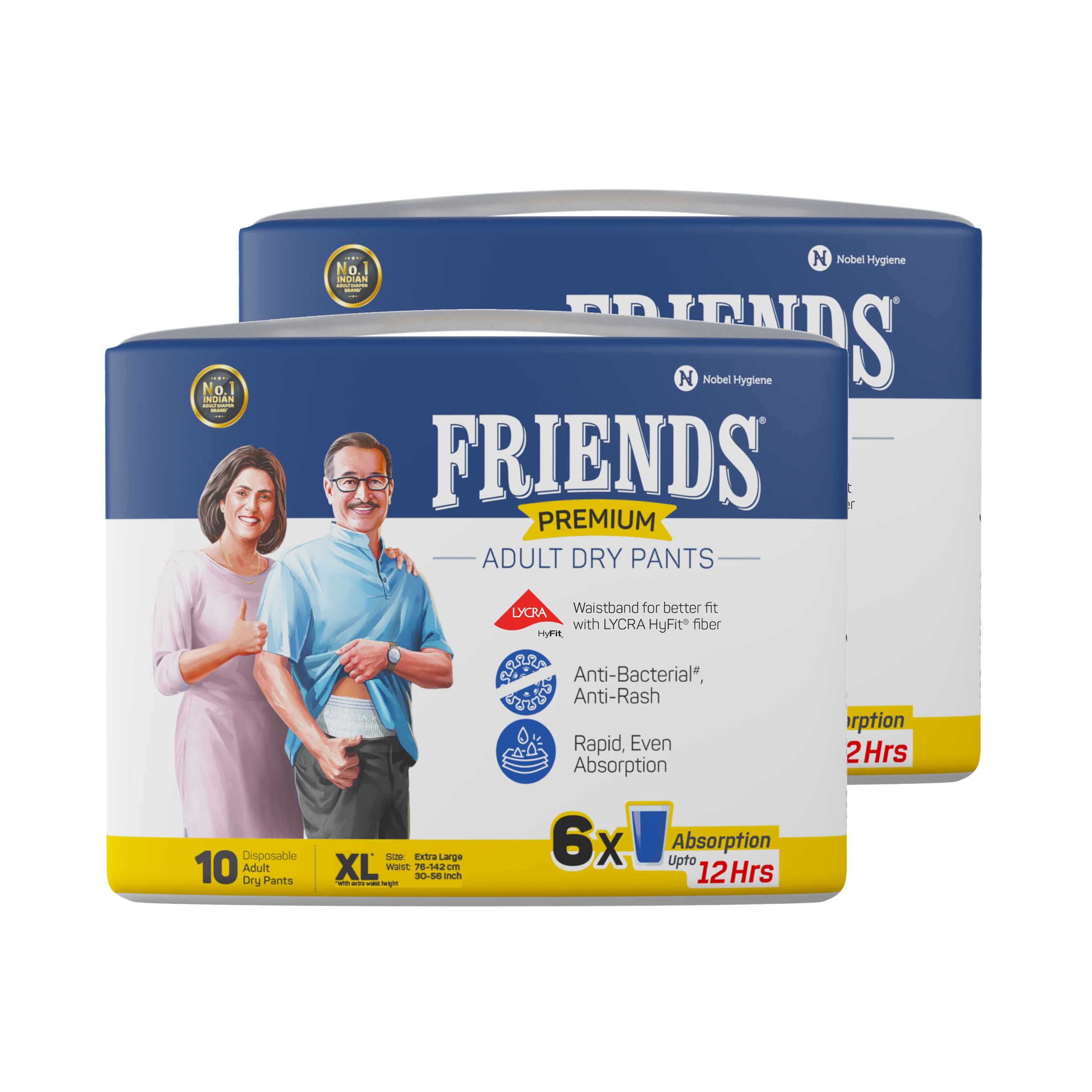 • Friends Adult Diapers extra-large size pant style with 12 hours of protection are also available in sizes M and L.