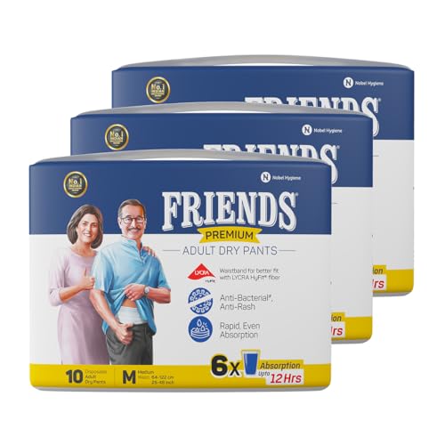 Friends Premium Adult Diapers Pants Style - 30 Count (Medium) with odour lock, Unisex, Leakproof, Elastic Waist and Anti-Bacterial Absorbent Core - Waist Size 25-48 inch; 63.5-122 cm