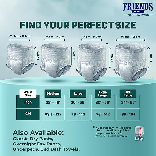 • Friends Adult Diapers extra-large size pant style with 12 hours of protection are also available in sizes M and L.