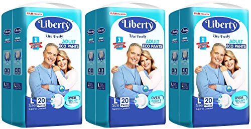 Liberty Eco Adult Diaper Pants Unisex Large 3x20 Pcs Waist Size (75-140 cm | 30-55 Inches) (Pack of 3)Adult Incontinence should just be a Worry free impediment in your advancing years. We introduce to you Liberty Adult Pants to help you enjoy the golden Years Worry free. Made with extra soft materials. Underwear like shape with additional supporting elastics. It give your freedam of mobility with the extra absorbrnt slim core stabilized with fluid distribution channels.Liberty Eco Adult diaper pants Large 20 pcs (75-140 Cms || 30-55 inches)Adult Eco Pants | Overnight Protection Adult Incontinence should just be a worry-free impediment in your advancing years. We introduce to you Liberty Adult Eco Pants to help you enjoy the Golden Years worry-free. Made with extra oft materials it gives your freedom of mobility with the extra absorbent slim core stabilized with fluid distribution channels.