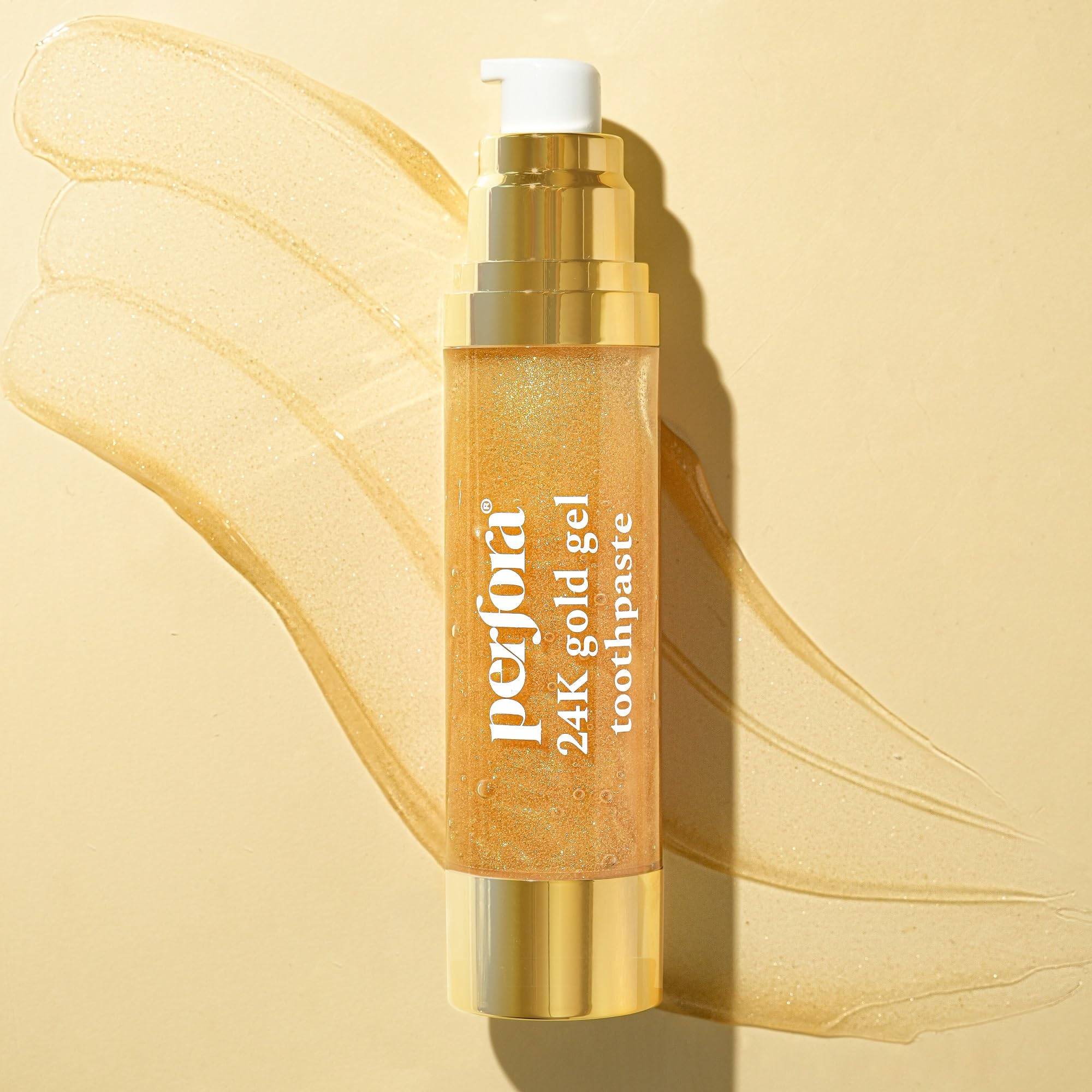 24K Gold This gold gel contains real 24 karat gold leaf so that your teeth can shine bright. All that glitters will be your smile! Unlike your regular toothpaste this Gold toothpaste comes in a airless pump bottle that makes it super convenient to take th