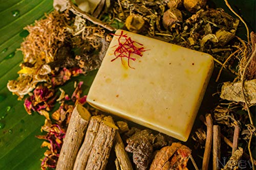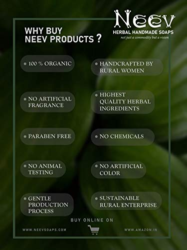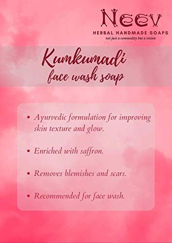 Ingredients:Organic Sesame oil infused with herbs of laksha, manjishtha, madhuyashtika, kaliyaka, usheera, padmaka etc as per ayurvedic recipe of Kumkumadi oil; Palm Oil, Castor Oil, Organic Coconut Oil, Organic Mahua Oil, Pure Kashmiri Saffron, Powdered Vetiver, Powdered Almond, Fresh Aloevera gel, Camphor, Purified Water, Lye, Pure Essential Oils of Jasmine, Vetiver, Peppermint, Sandalwood, Rosewood.Benefits : Herbal Soap to wash off face. It improves skin complexion and texture, relieves blemishes, acne, scars and black heads, has anti ageing qualities."Neev Herbal Handmade Soaps is a social enterprise based on Integral Living that reveres and celebrates harmony between man and nature. We aim to produce the highest quality handcrafted herbal products while providing a dignified means of employment for rural women and regenerating rural economyÃì