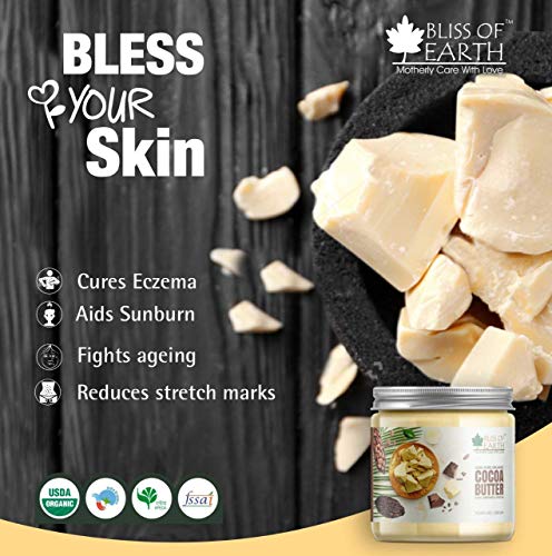 DISCOVER THE BEAUTY OF YOUTHFUL GLOWING SKIN AND SOFT LUSCIOUS HAIR WITH THIS ONE NATURAL AND PURE BUTTER. Do you need the remedy for one of these common skin and hair issues? Stretch marks Scars Blemishes Eczema?- Dry cracked skin heels lips? - Wrinkles Fine lines? - Dry cracked nails cuticles? - Dry Dehydrated Frizzy Unruly or Brittle hair? - Minor cuts Burns Sunburn Diaper rash? And the list goes on... FINALLY GET THE BEAUTIFUL SKIN AND HAIR OF YOUR DREAMS WITH BLISS OF EARTH 100% PURE ORGANIC RAW COCOA BUTTER Bliss of earth cocoa butter is unrefined meaning it has not gone through a chemical extraction process that overheats and bleaches the butter leaving it with less of its healing properties. Because our butter is so pure it has an amazing lip smacking chocolaty aroma. Our Cocoa butter is ultra healing because it has high contents of antioxidants essential fatty acids vitamins E and K the beauty vitamins. Our butter is sealed in our controlled environment and will come to you just as you see it. This butter is perfect for fighting ageing and stretch marks conditioning your hair or beard and moisturizing your skin. You will be hooked on how this butter makes you look and feel. IT'S TIME FOR YOU TO EXPERIENCE TRULY PURE COCOCA BUTTER AND REVEAL HOW GORGEOUS YOUR SKIN AND HAIR CAN BE. We you will be 100% satisfied and in love with your new skin and hair or your money back. SO EMPTY OUT YOUR BEAUTY CABINET AND ADD BLISS OF EARTH 100% ORGANIC COCOA BUTTER TO YOUR CART NOW AND ENJOY BEING IN YOUR OWN SKIN.