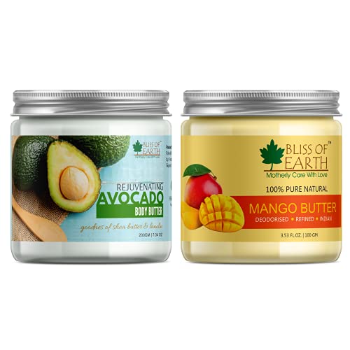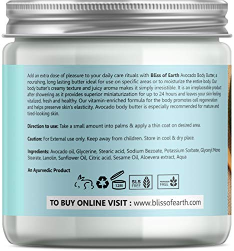 Add an extra dose of pleasure to your daily care rituals with Bliss of Earth Avocado Body Butter a nourishing long lasting butter ideal for use on specific areas or to moisturize the entire body. Our body butterocreamy texture and juicy aroma makes it simply irresistible. It is an irreplaceable product after showering as it provides superior miniaturization for up to 24 hours and leaves your skin feeling vitalized fresh and healthy. Our vitamin-enriched formula for the body promotes cell regeneration and helps preserve skinoelasticity. Avocado body butter is especially recommended for mature and tired-looking skin.
