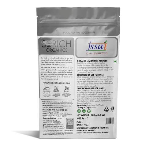 For extra love & care for your Skin Sorich Organics brings you the Lemon Peel Powder. This Powder fulfills a variety of your Skin Needs Helg to enhance Natural Beauty. Being rich in vitamin C Grated Lemon Peel Is Effective Enough To Treat Pigmentations And Sun Tan. Lemon peels and lemon powder help prevent and fight skin problems such as wrinkles acne pigmentation and dark spots. The free radicplay a very important role in this process. Besides antifound in the peels tend to be a great ifier of the skin. Working as a natural exfoliating agent that helps to remove excess dirt oil and other impurities and gives soft supple glowing skin.