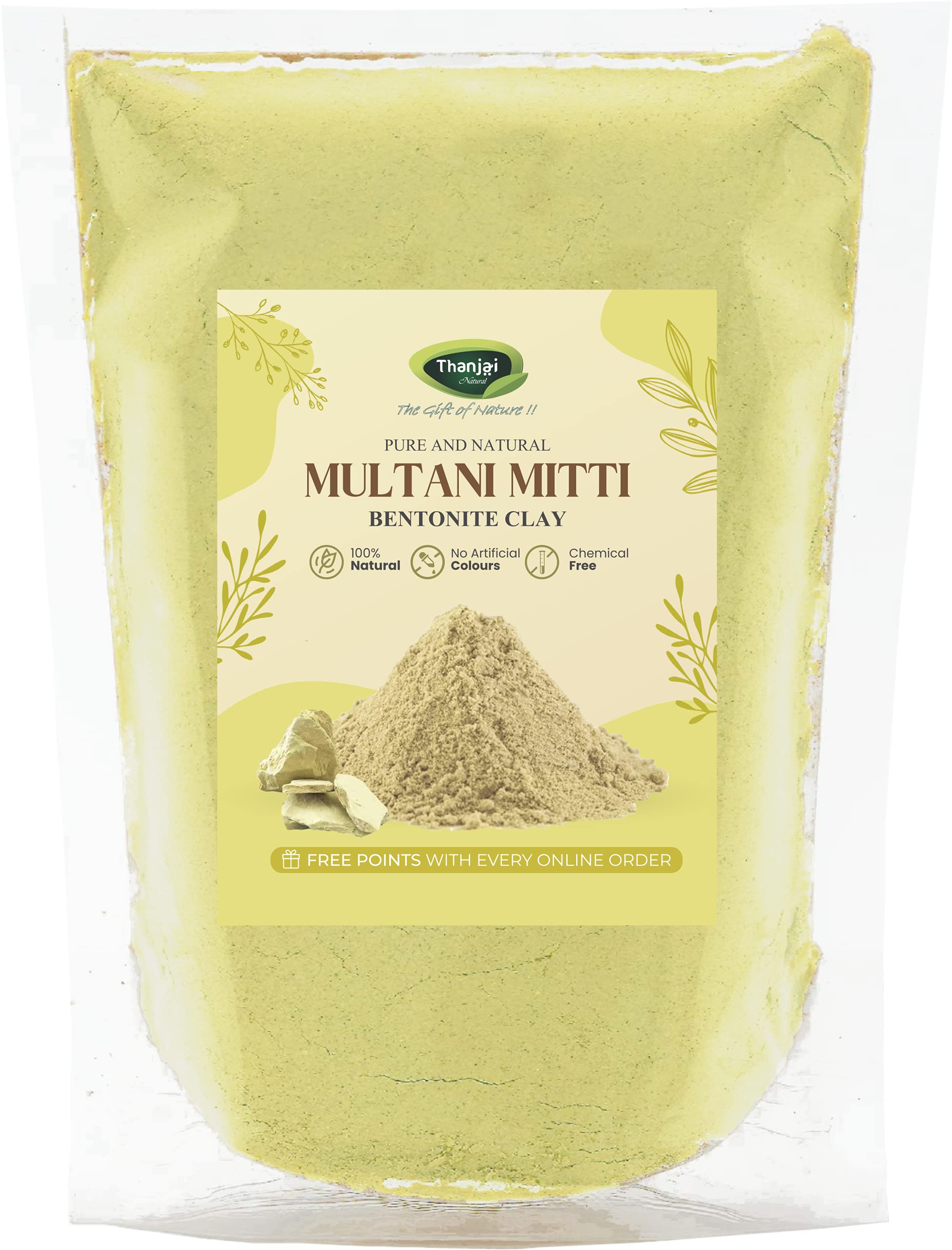 Multani mitti for face pack: Stops acne pimples causing unwanted excess oil from the face. Multani Mitti powder for skin whitening for the face. It has a higher concentration of vitamins minerals. It contains Vitamin C which helps to form collagen and elastin which is the secret to beautiful skin. The Multani mitti powder or fullers earth powder is fit for all skin types whether dry oily sensitive or normal. It rejuvenates the skin and maintains youthful skin by retaining moisture. It is also useful for maintaining the natural shine of the face. Heals acne-prone skin: Including Multani mitti powder or bentonite clay in our daily skincare regimen can be extremely helpful in keeping acne scars pimples signs of aging wrinkles sagging skin fine lines dark spots etc. It helps in removing acne and blemishes from the skin | It reduces pigmentation and suntan | Reduces oiliness of the skin | improves texture of the skin Controls Oil Production: Not only does the use of Multani mitti help purify your skin but it also helps regularize oil production for both oily and dry skin types Bye-bye to oily skin: Multani mitti is known to absorb excess oil or sebum from oily skin. It will help to control excessive oil production and will keep your skin fresh and toned. Anti-oxidant properties will help to keep the annoying pimple away. Get a wonderful glowing soft and smooth skin with the Thanjai Natural Multani mitti powder. Regular application of this face pack can add a natural glow to the skin and offers a soothing freshness to your dry skin making it soft and supple Effective in unclogging your skin pores by pulling dirt and excess oil out and will also diminish your existing blackheads. Use this face pack twice a week it will suck all your facial concerns and impurities from deep pores flaunting the facial skin. Natural Cleansing face pack How to Apply Step 1- Mix 2 tbsp each of Multani mitti faces pack powder and 8 tbsp of Rosewater. Step 2- Prepare a mask store