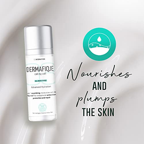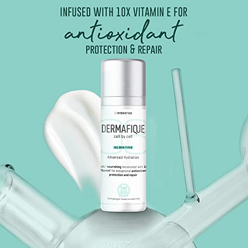 During the day your skin is exposed to multiple environmental aggressors like pollution and dust to name a few. Free radicare o known to wreak havoc on your skin. Free radicare nothing but unstable molecules in the air that react with your skin to cause cellular damage. When your skin does not have enough antito neutralise free radicit gives rise to oxidative —one of the main causes of skin ageing. This is why you need a day cream enriched with a powerful antioxidant to fight free radical damage repair skin from past damage and simultaneously nourish and hydrate your skin. Advanced Hydration is a moisturising day cream that is enriched with the goodness of 10x Vitamin E. It deeply nourishes the skin and provides antioxidant protection and repair against oxidative caused by the effects of environmental conditions. Dermafique encourages you to follow a smart new derma-routine: 01 cleanse. 02 tone. 03 hydrate for healthy zen-like skin. Advanced Hydration is a part of the hydrate portfolio - step 03 of a highly effective system that des cleansed balanced and hydrated skin.