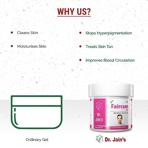 "Wash face with normal water and pat dry. Apply to the skin and gently massage for 2-3 mins. Do not apply near the eyes. Wash with cold water after 20 mins. Use it at least twice a week for 3 months to see effective results. Can also apply and leave overnight. BENEFITS - Clears Dead Skin Cells Improves Complexion Treats Dark Spots Removes Skin Tan Combats Hyperpigmentation Of Skin Maintains Youthfulness Removes Toxin DESCRIPTION - Dr. Jain's Herbal Products is one of the well-recognized manufacturers of Herbal Health Skin & Hair Care Ayurvedic Powders Gels & Aromatic Essential Oils. As per the demands a well-researched formulation based on pure herbal and superior quality Ayurvedic products. Faircom Fairness Gel is a 100% Natural Fairness treatment that effectively stops Hyperpigmentation throughout the body irrespective of the skin type and age- group. It adds soft smooth and natural radiance to the face. It effectively treats dark spots and dark circles."