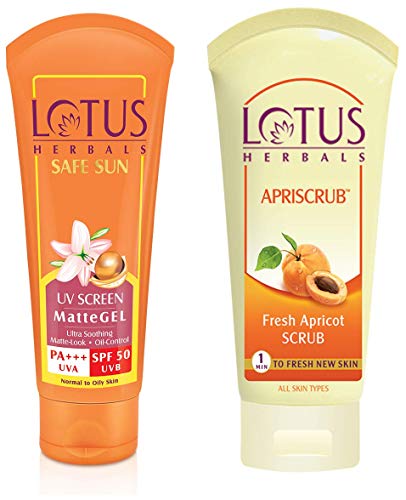 Lotus Herbals Safe Sun UV Screen Matte Gel SPF 50 100g And Herbals Apriscrub Fresh Apricot Scrub 100g