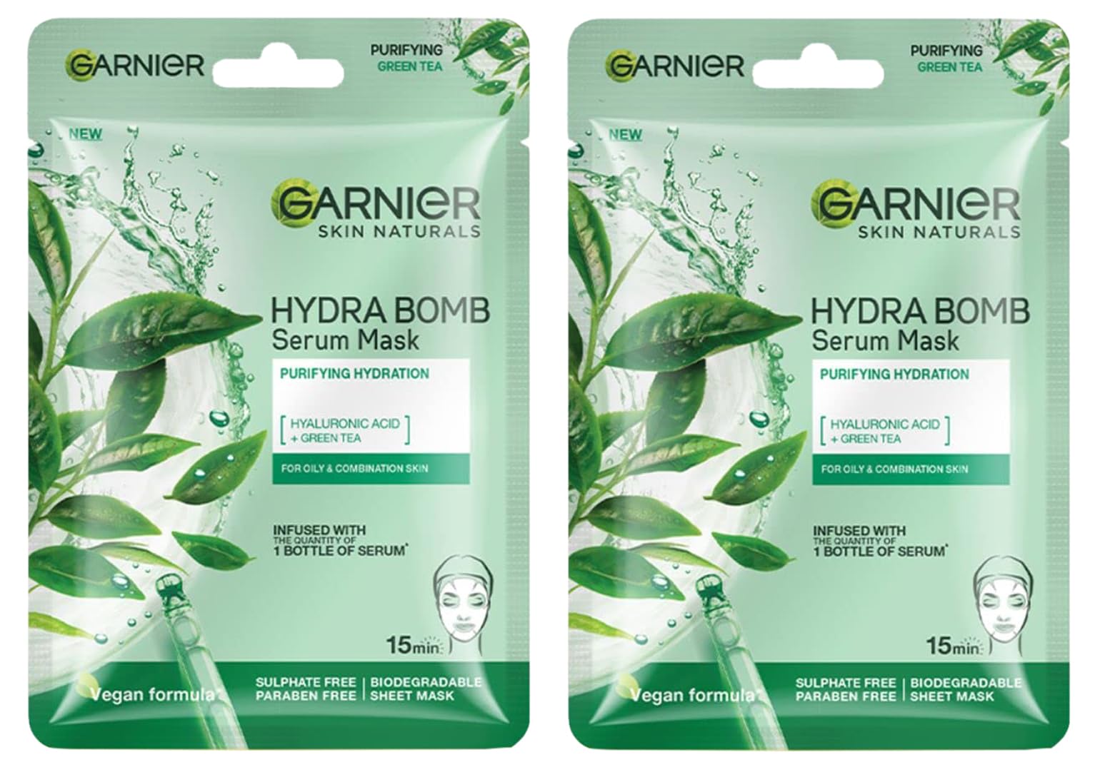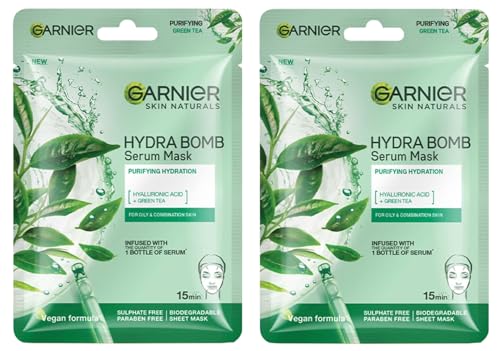 Garnier Skin Naturals, Serum Mask, Purifying & Pore Reducing, Hydra Bomb Green Tea Mask, 1 pc, 28g (Pack of 2)