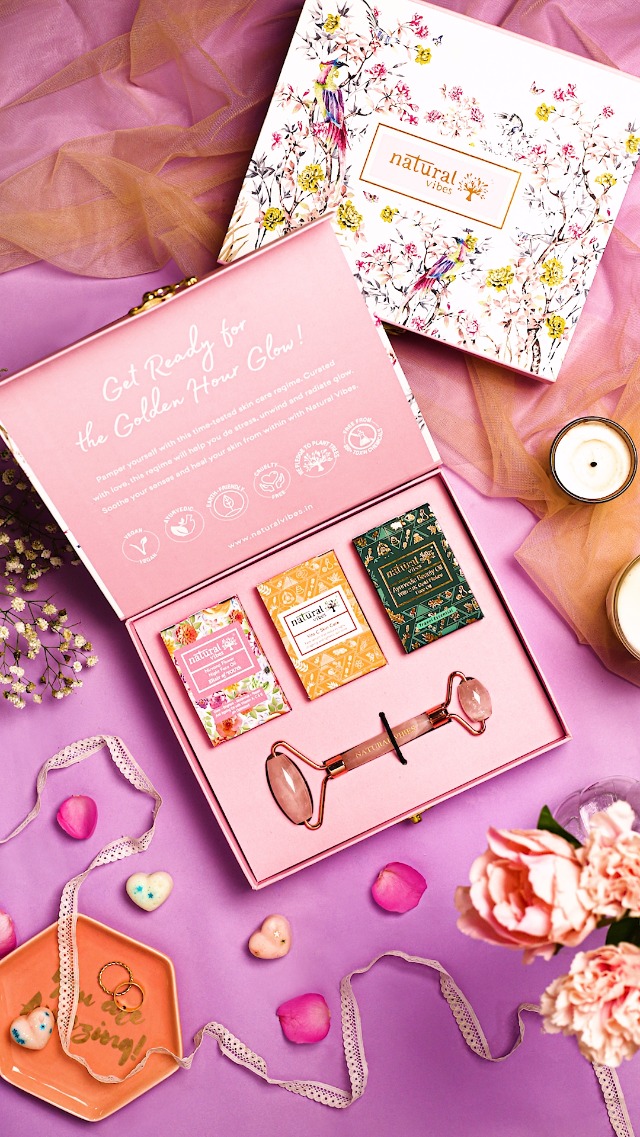 • GLOW BRIGHTEN & TIGHTEN - Pamper yourself with this time-tested skin care regime. Curated with love this regime will help you de unwind and radiate glow. This beautiful gift set contains a Jade Face Gua Sha Vitamin C Serum 3ml Nirvana Flower Oil 3ml and G
