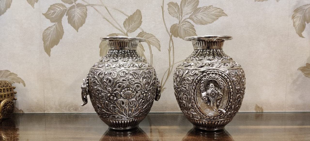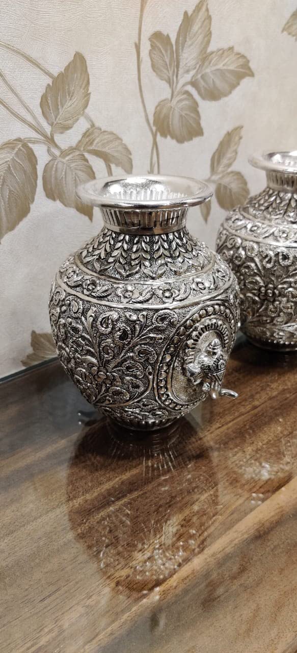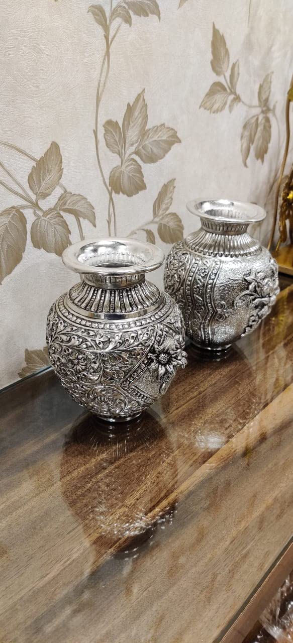 Add a dash of vintage to your home with this antique silver-plated vase by us. This vase shows off the traditional craftsmanship of the artisan. It has an intricately hand carved design with pure silver plating that suits every ambience and is perfect for gifting. Wash & Care - A Handmade product that requires Handling With Care. Gently Clean with soft dry cotton cloth. Donot scrub with hard material. We manufacture the product & make it in the best quality to maintain the richness of your home!! Our products are indigenously produced from raw sheets to the finished product so that quality style and design with the international finish are controlled and achieved. Each product has been so well researched keeping in mind the personal requirements of the individuals.