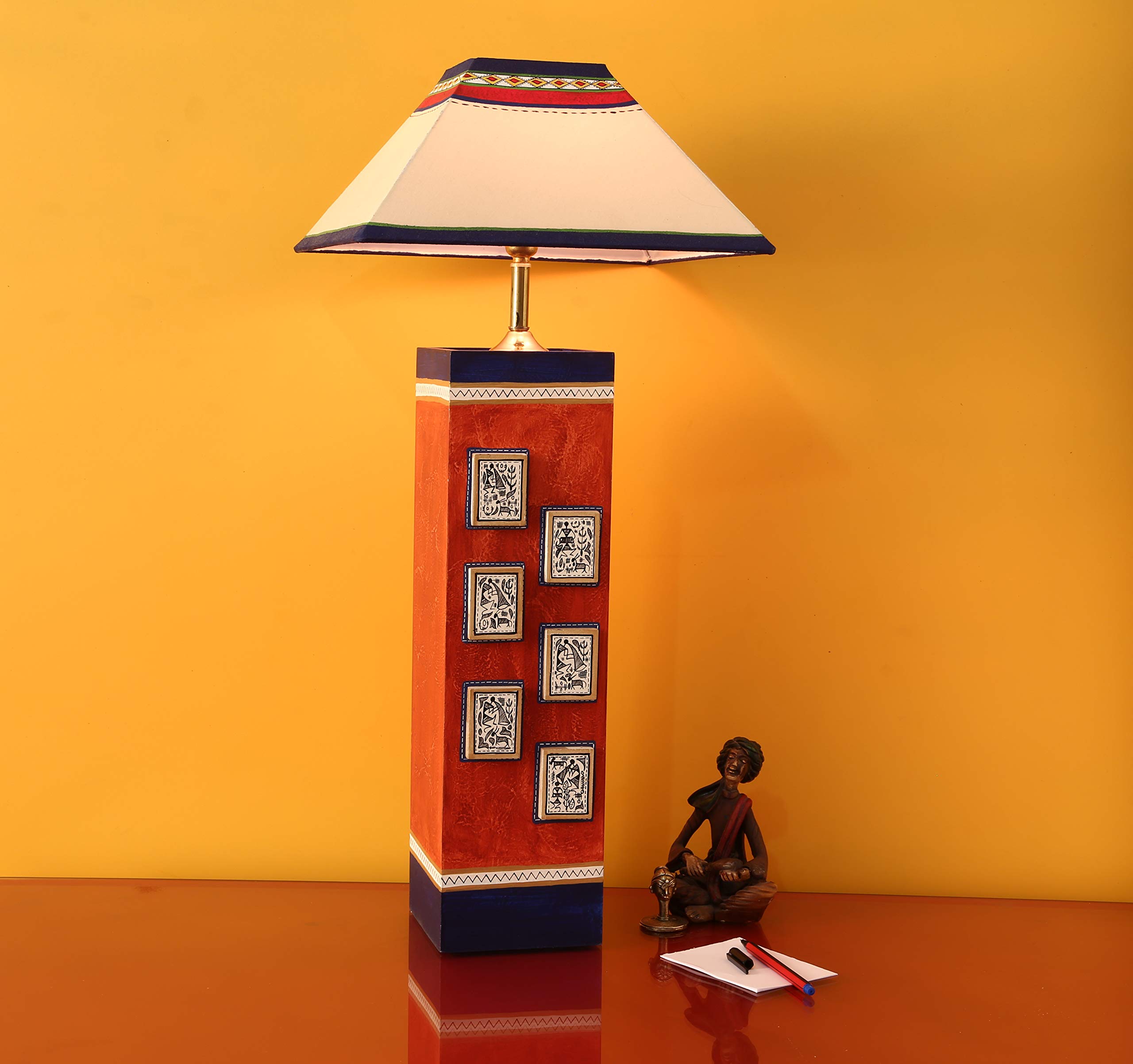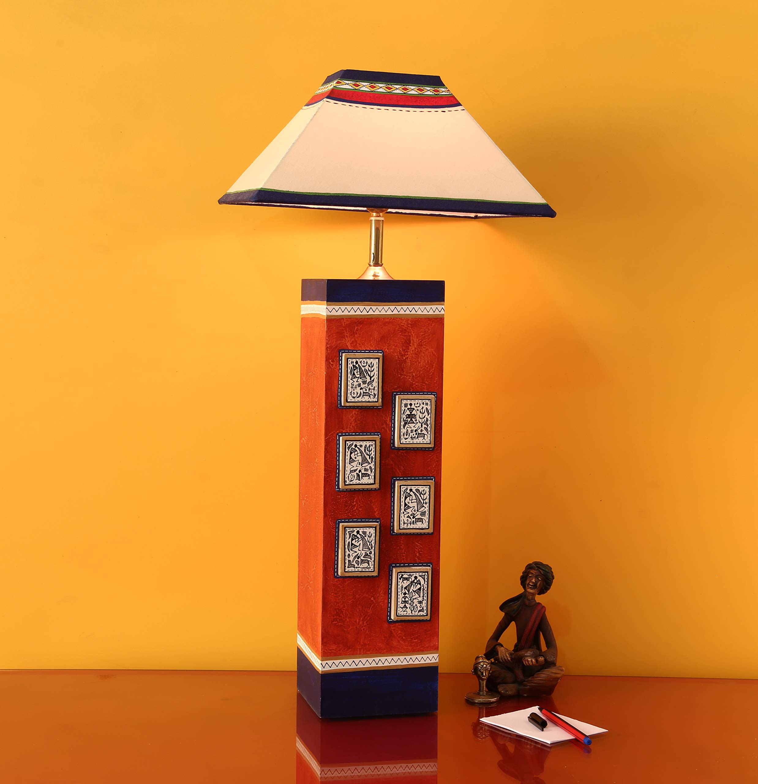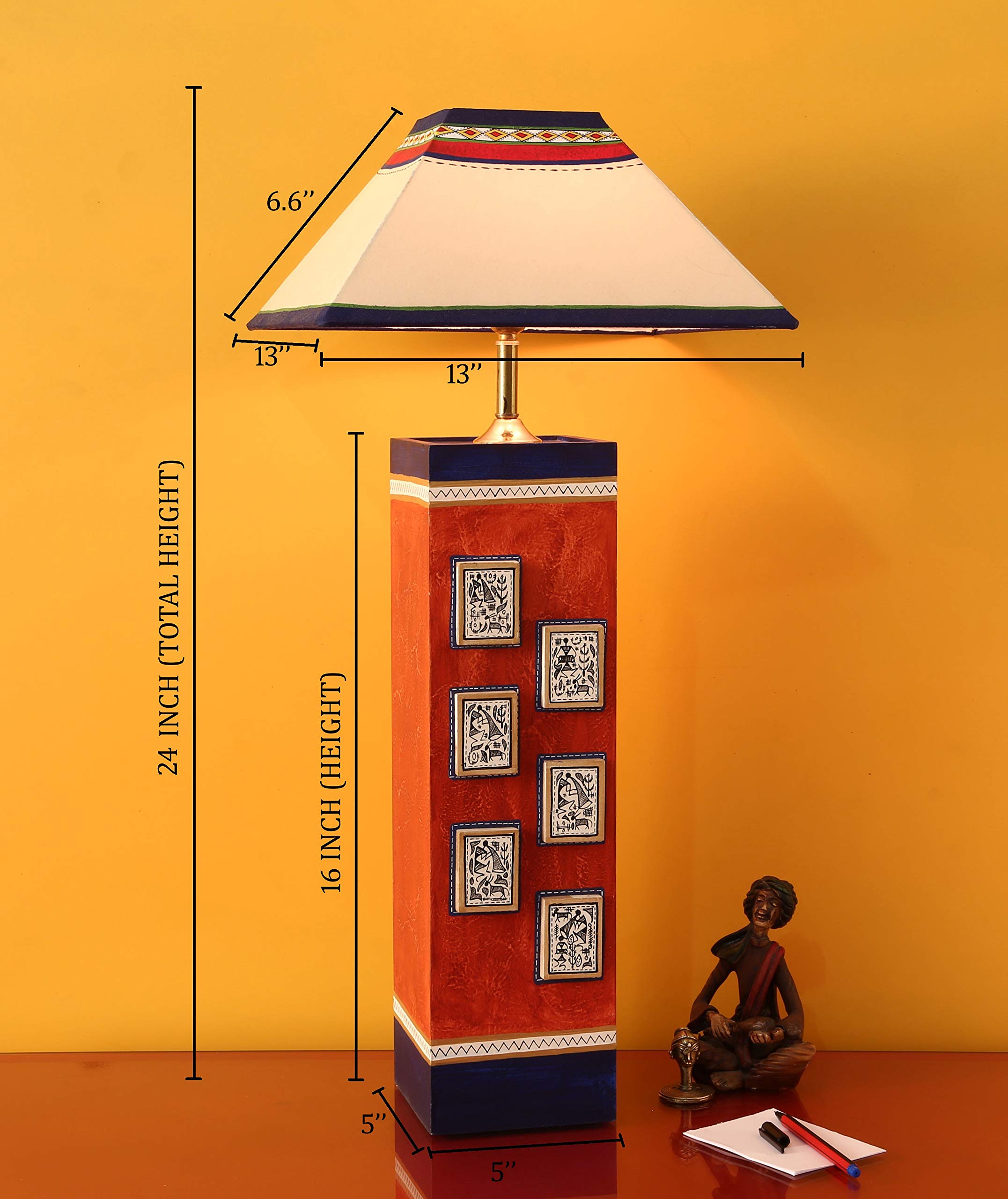 KHURJA POTTERY 'Warli Cuboidal' Lamps for Home Decoration - Table Lamp for Living Room Decorative Wooden Table Lamp for Bedroom Bedside Lamps (Orange 24 Inch)
