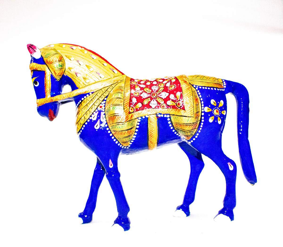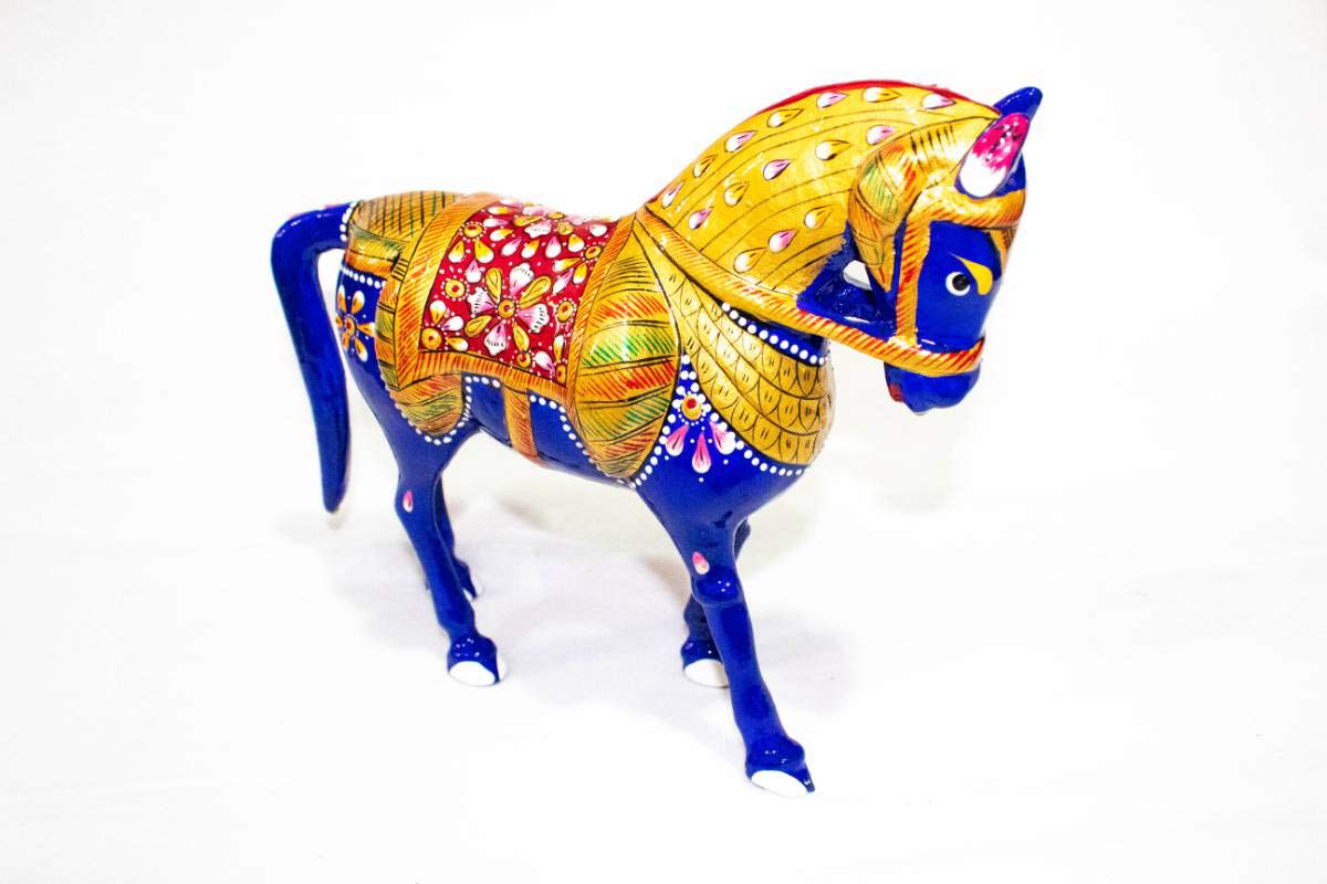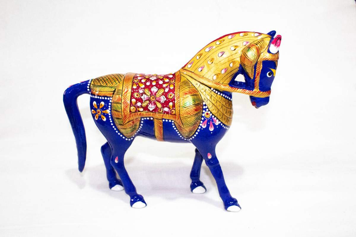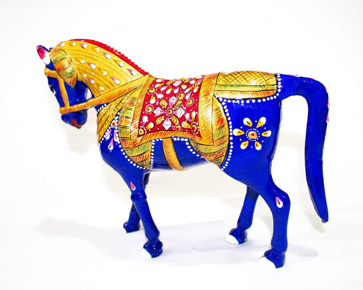 CHURU SANDALWOOD CARVED 8" Metal Meenakari Horse Spiritual Auspicious Handmade Decorative Showpiece Figurine