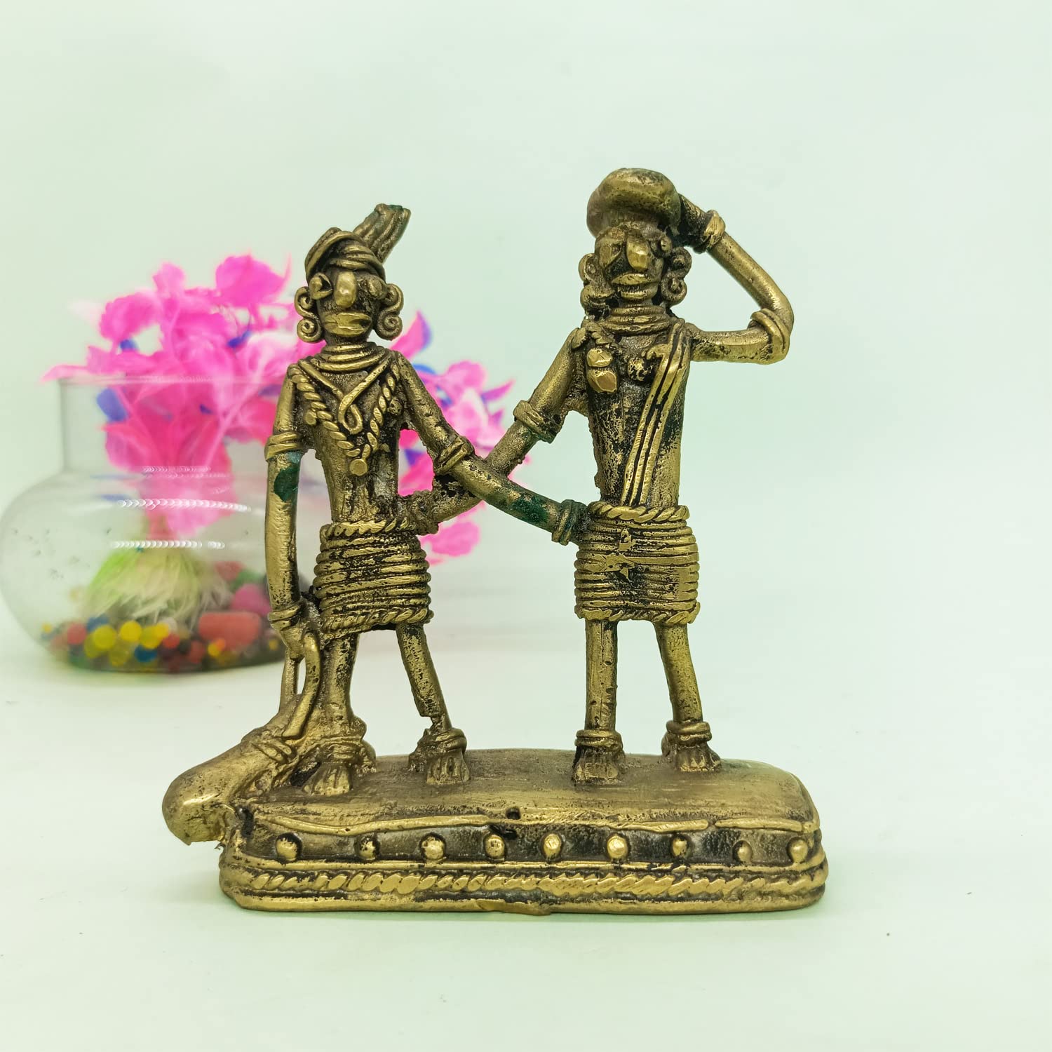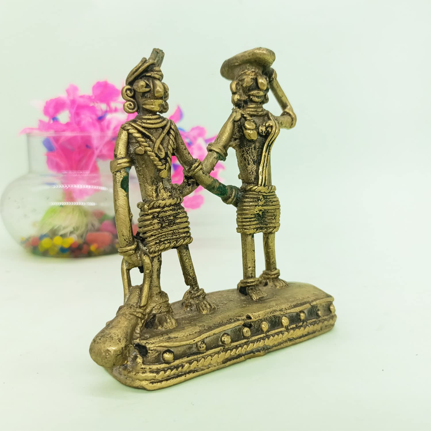 DHOKRA CRAFT brings you this decorative tribal Madiya Madin figurine made of good-quality brass. Madia Madin is a tribal term taken from Abhujhmandh and is taken from the people of the place Abhujmadhiya. Abhuj means unknown and Madiya refers to the people who live there. Madia is the word used for men and Madin for women. Abujmadia practices jhoom agriculture on the hills also called penda agriculture. Crafted by the tribal artisans of Chhattisgarh (Dhokra art of Chhattisgarh). Dhokra craft is a casting technique using age-old wax casting. Hence the product might have some black/dull patches which is a symbol of handcrafted Dhokra art. Please note: Due to various types of lighting and flash used while photo shoots the colour shade of the product may vary.