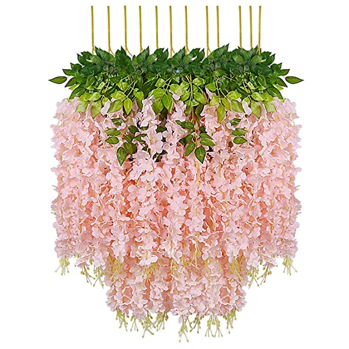 Looking for a unique way to bring the wedding festival Ganpati and pooja decor together? These hanging flowers will help to set the stage and add beauty to your wedding. The best part is that they're easy on the eyes and hard to miss as well. These wisteria-shaped hanging flowers are a great way to add pizzazz to your pooja ghar home room birthday anniversary New Year Xmas Event or Party Decorations. Perfect for ceremony sets gazebos or as centerpieces for tables these flower garlands create a modern organic vibe that's perfect for any wedding theme or color scheme. Our Wisteria Hanging Flowers are a wonderful addition to your wedding decor. They will bring a fresh floral touch to your wedding and they also create lovely centerpieces or table decorations.
