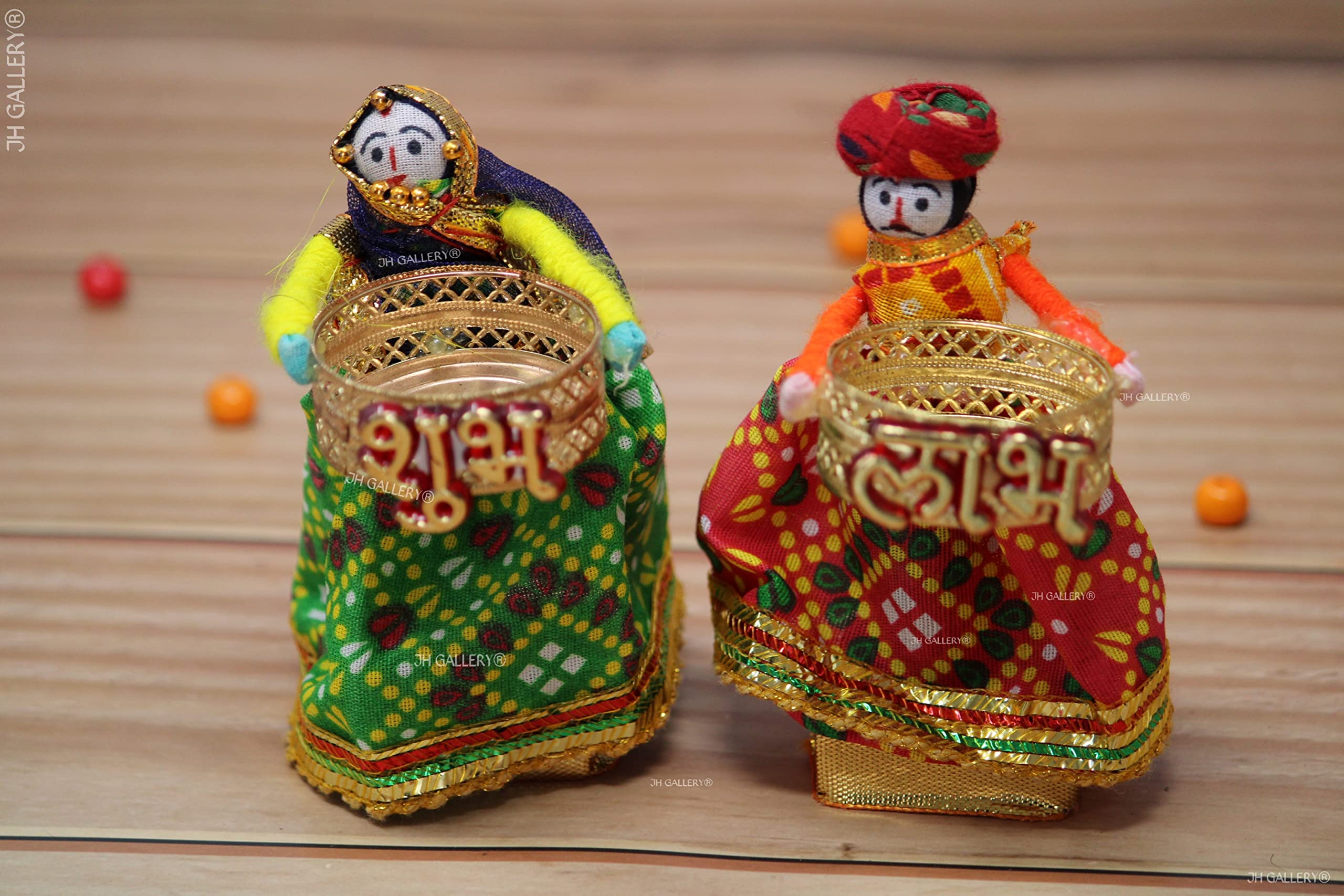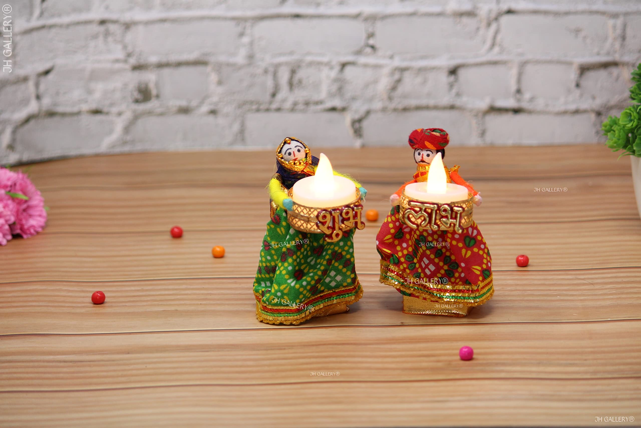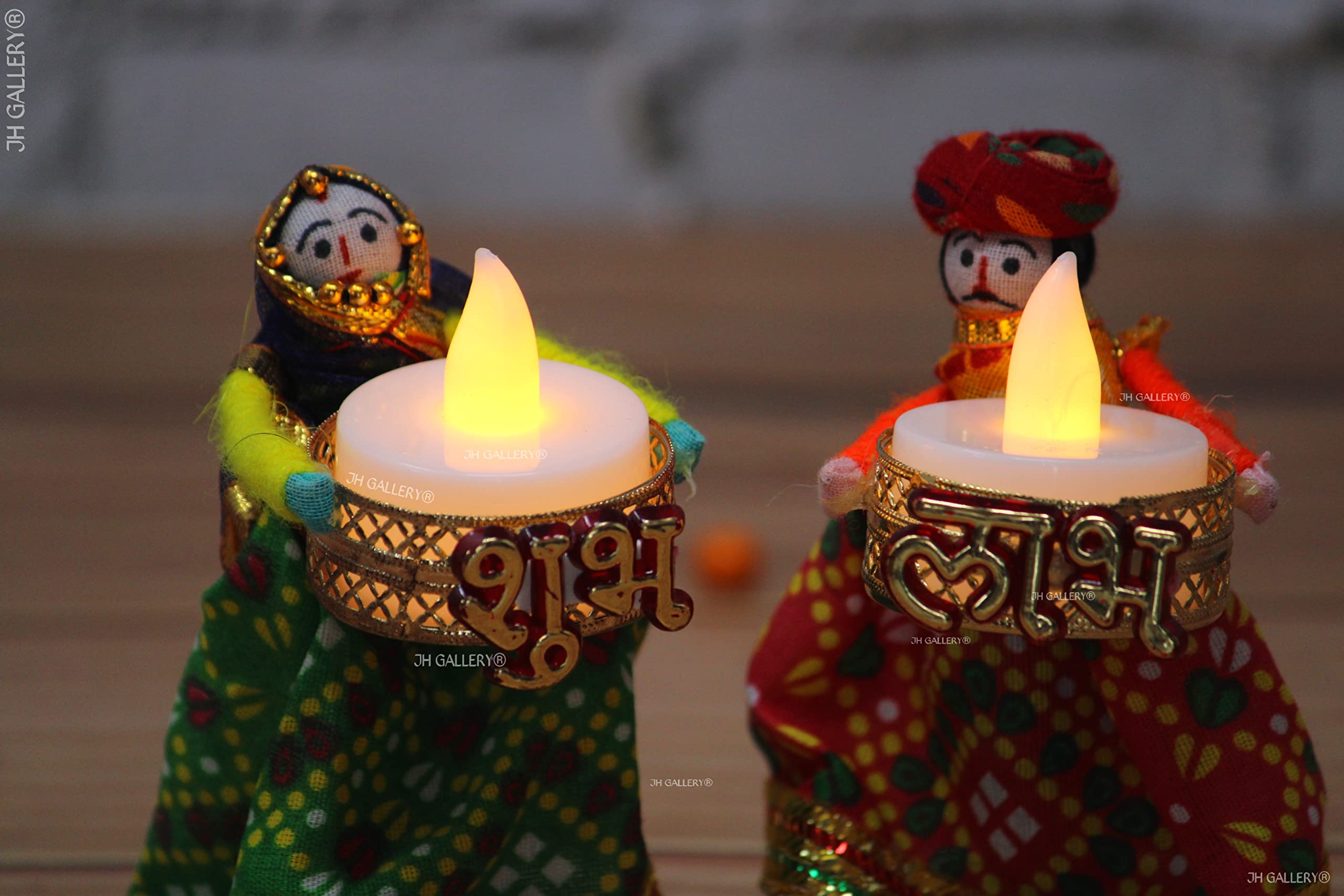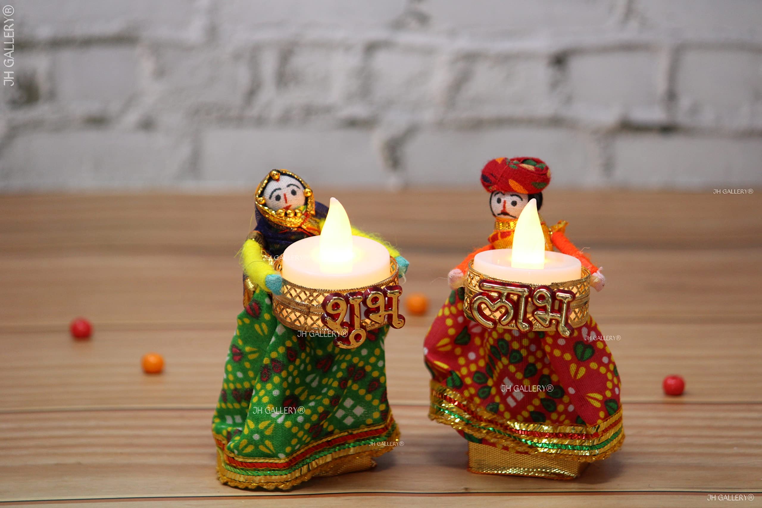 RAJASTHANI PUPPETS Handmade Puppet Diyas Rajasthani Dolls Shubh Labh Tealight/Diya/Diwali Diya/Idol Diyas Holders Gift for Diwali Multicolor (1 Pair)