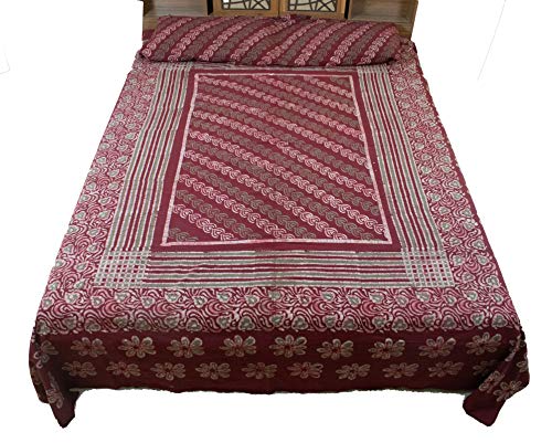 Color Name:Maroon - PistaEthnics of Kutch presents Kutchhi Traditional Wax Batik Hand Block Printed Handicraft Double Bedsheets. These cotton bedsheets are Hand printed with typical Wax Batik Process. Batik Prints are unique to Mundra region in Kutch and is highly revered Handicraft. Kutchhi Wax Batik Print is an Art mastered by Kutchhi Artisan to create Vivid Beautiful Designs with the help of hot melted Wax on the Fabric. Fabric is applied Melted Wax. Then Fabric is dipped in hot dye. Seepage of dye through cracked Wax create Batik Pattern. This particular Batik Dyed Suit is worked up with painting various shapes and golden lining giving it very rich look. The cotton Fabric make it useful and comfortable bedsheet for all seasons use.