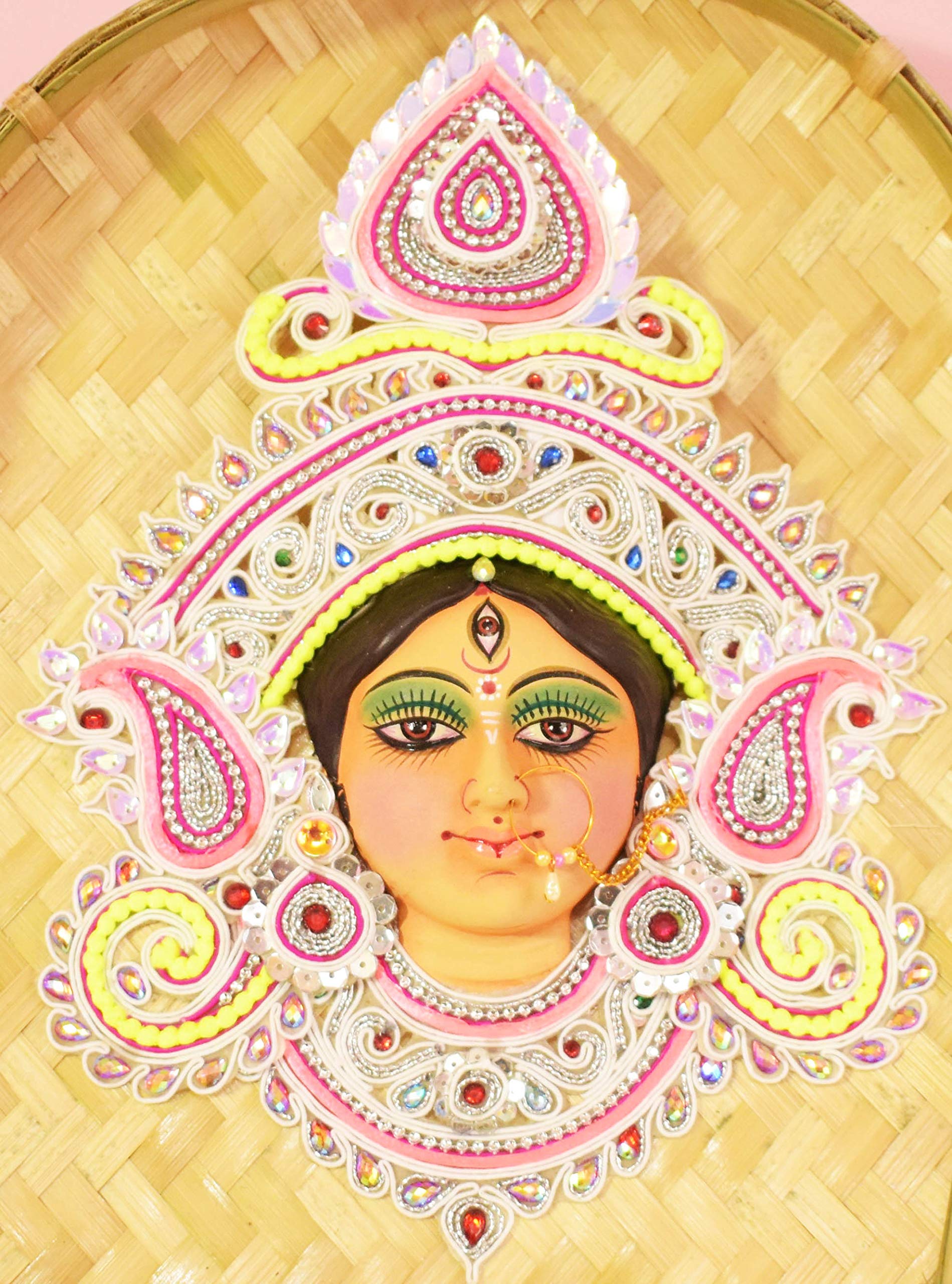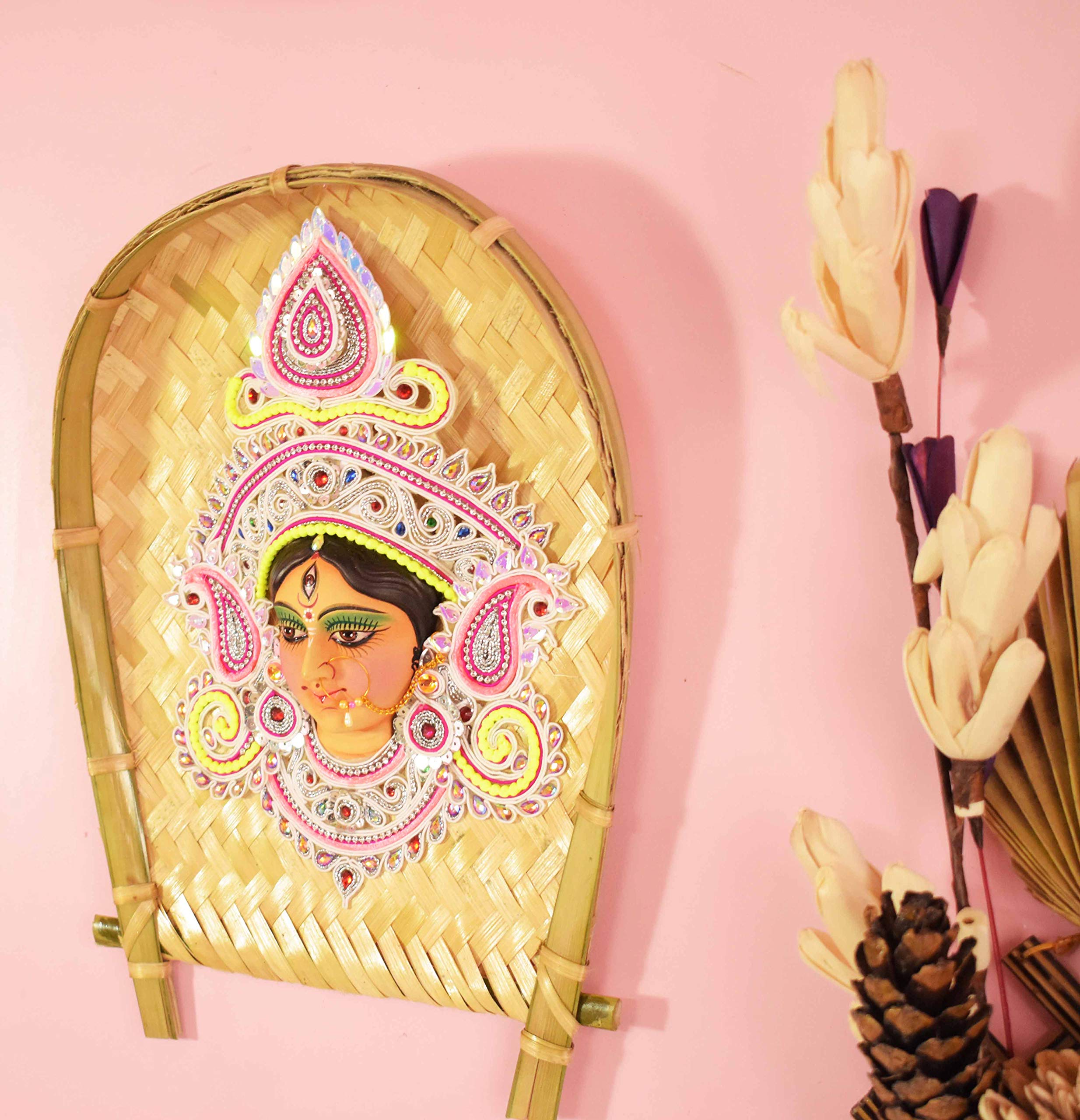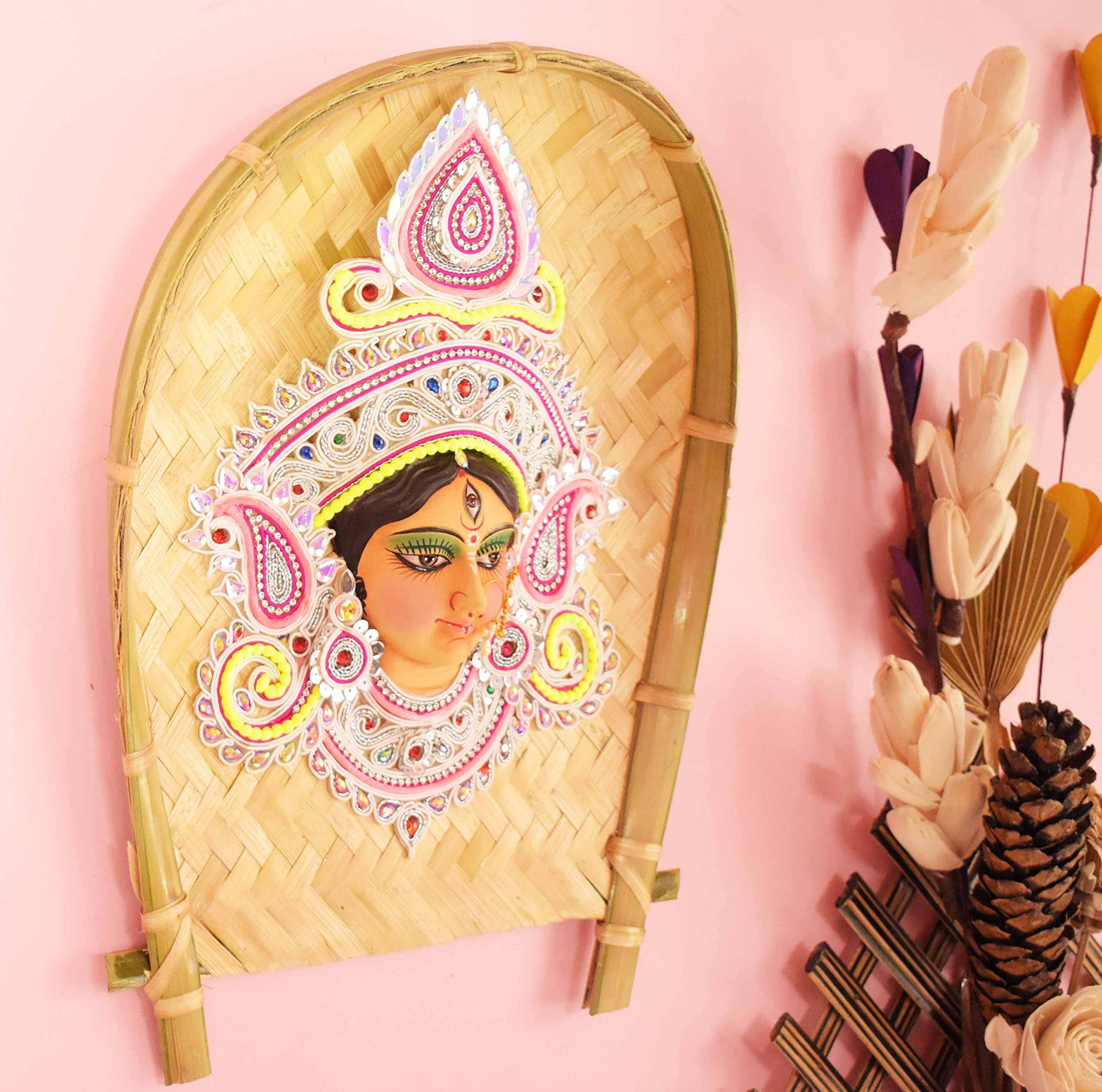 CANE & BAMBOO CRAFTS Decorative Wall Hanging Navadurgadurgashera wali mataji murti on 14X12 Inch Bamboo Kulo.(Maa Durga Multicolor) Clay