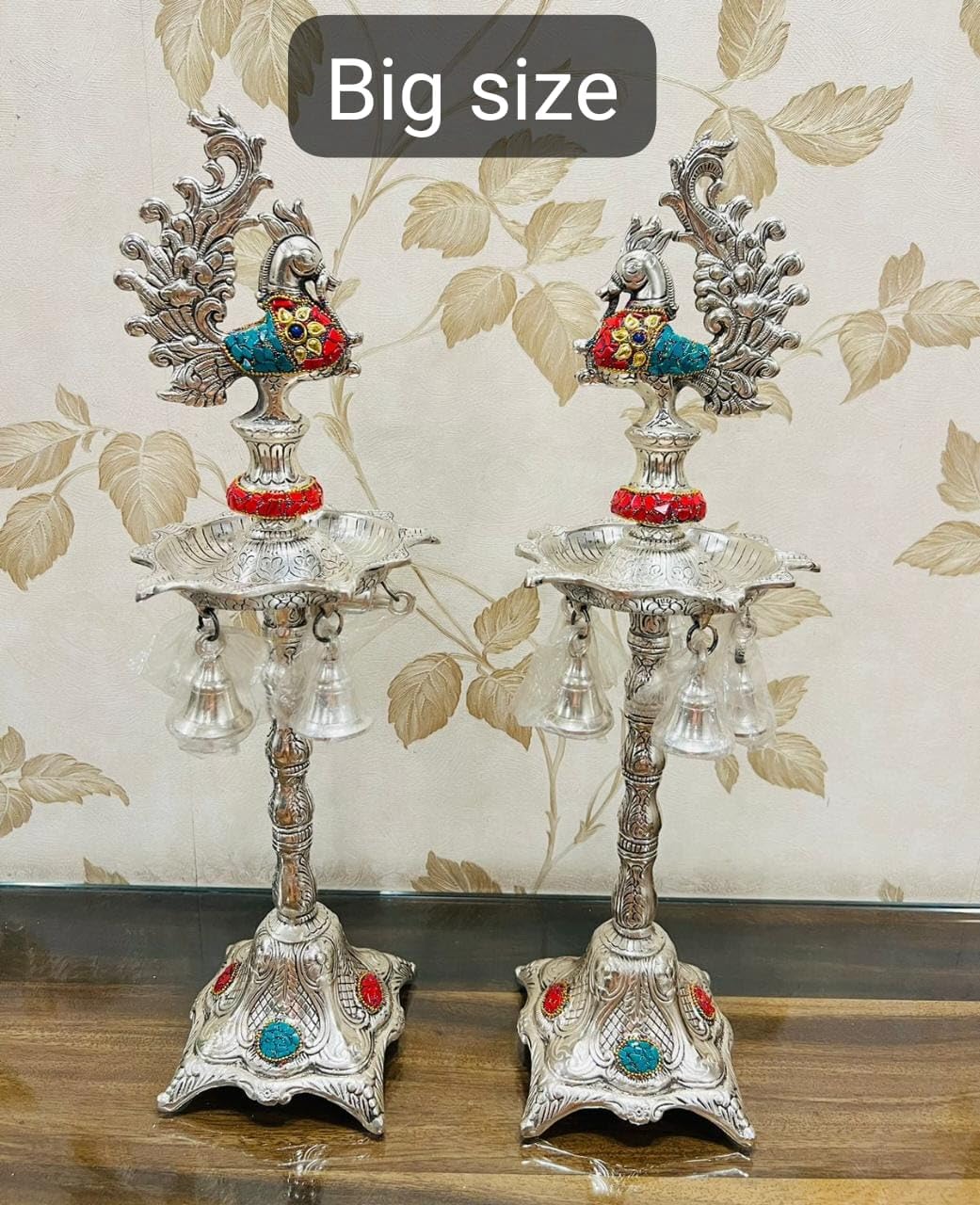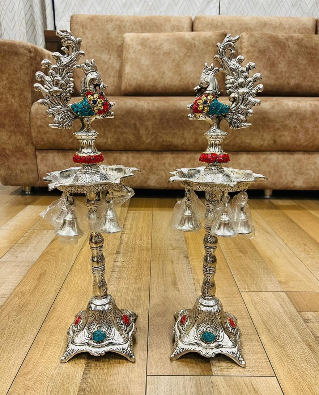 German Silver Brass Plated Peacock Samai Diya Diwali Gifts Metal Diya Handmade Indian Pooja Oil Lamp Silver Diya Lamp Akandh 5 Wick Diya Home Decor It is made from German Alloy Metal (Composition of Copper Zinc Nickel); which is finished with silver plating and "oxidized work" on its surface which gives it a "antique look". It has hand made work with beautifully hand crafting on German Alloy Metal. It is made by Metal carving work Rural India artisans who made it an accurate durable and washable product. Light up your home with this beautiful Ganesha Diya. Crafted from a quality German Silver Ganesha Figurine oil lamps add charm to the beauty. People light up these wick lamps for performing aarti of Gods they worship. These are also used as Diwali lights. Made in brass this is a solid piece of collectible figurine sculpture that you would be happy to keep at your home. Gift your loved ones this attractive Diya for special occasions. The premium bell has beautiful sound and is an essential for temple at home. This product is crafted from brass that is considered to be a sacred metal and traditionally used in prayer accessories. The sweet sound of this bell will fill the atmosphere with divine sound during any pooja / ceremony. German Silver Ganesha Samai Diya Diwali Gifts Metal Diya Handmade Indian Pooja Oil Lamp Silver Diya Lamp Akandh 5 Wick Diya Home Decor Illuminate your home with the enchanting beauty of our German Silver Hand-Engraved Peacock Samai/Diya with Bells. This exquisite piece combines traditional craftsmanship with elegant design creating a mesmerizing addition to your festive decorations or everyday ambiance. Crafted with meticulous attention to detail our samai/diya showcases the artistry of skilled artisans. Made from premium German silver it boasts a radiant shine and durability that will withstand the test of time. The intricate hand engravings on the surface depict a graceful peacock motif symbolizing beauty prosperity