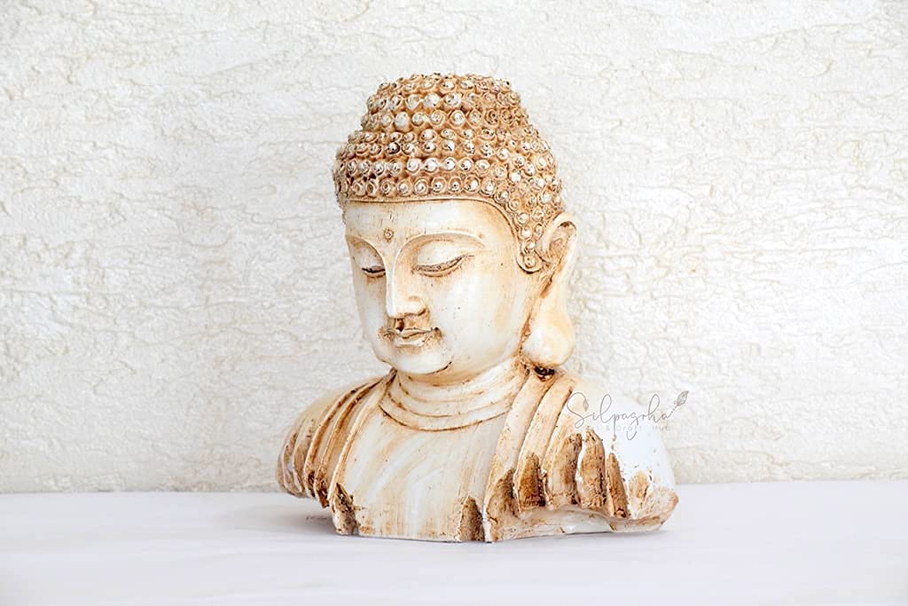 CHURU SANDALWOOD CARVED Trending Good Luck Vastu-fengshui Decorative Small Buddha Bust (Cream-Golden Multicolor 7inch)