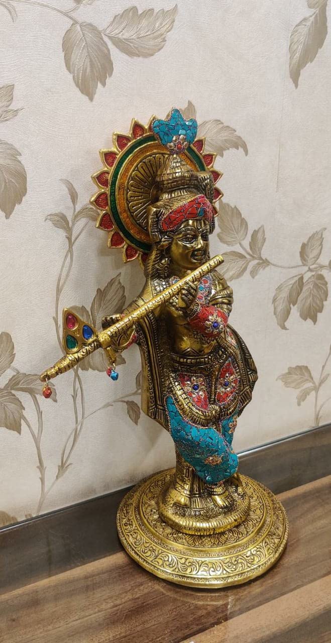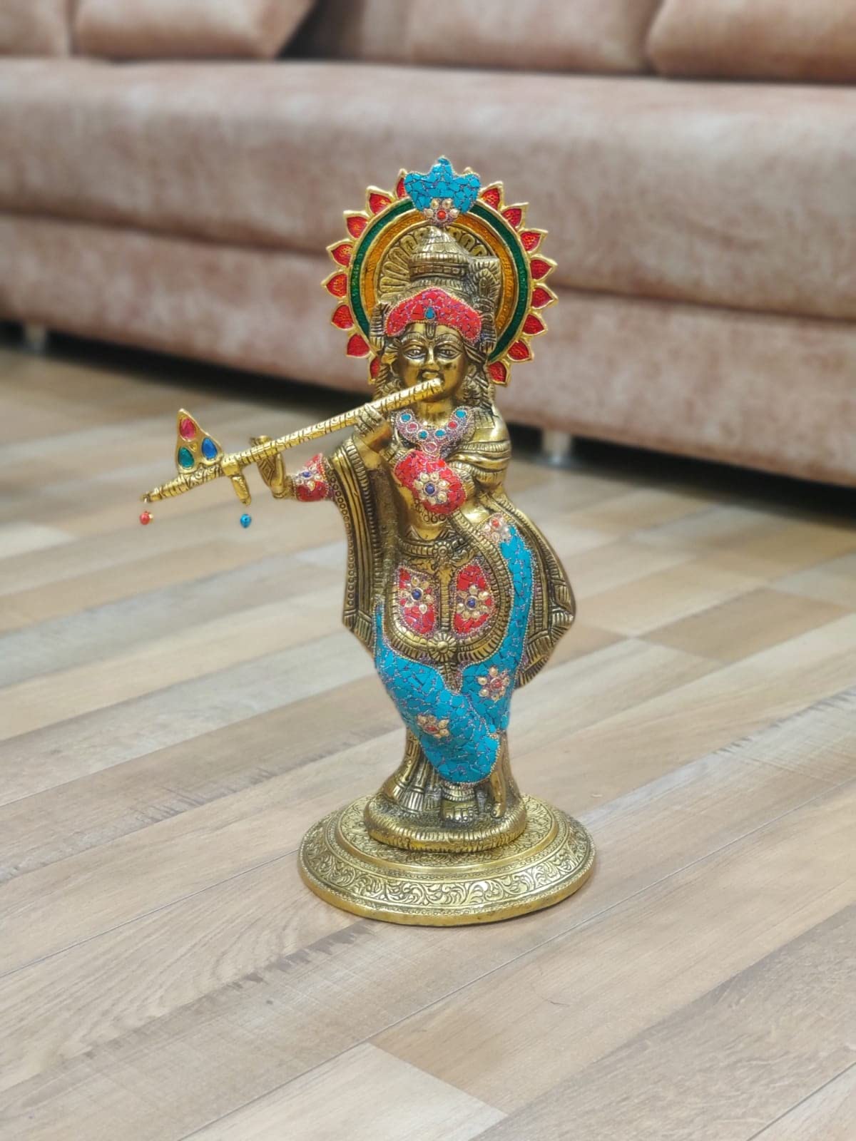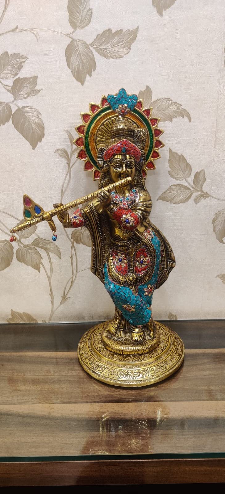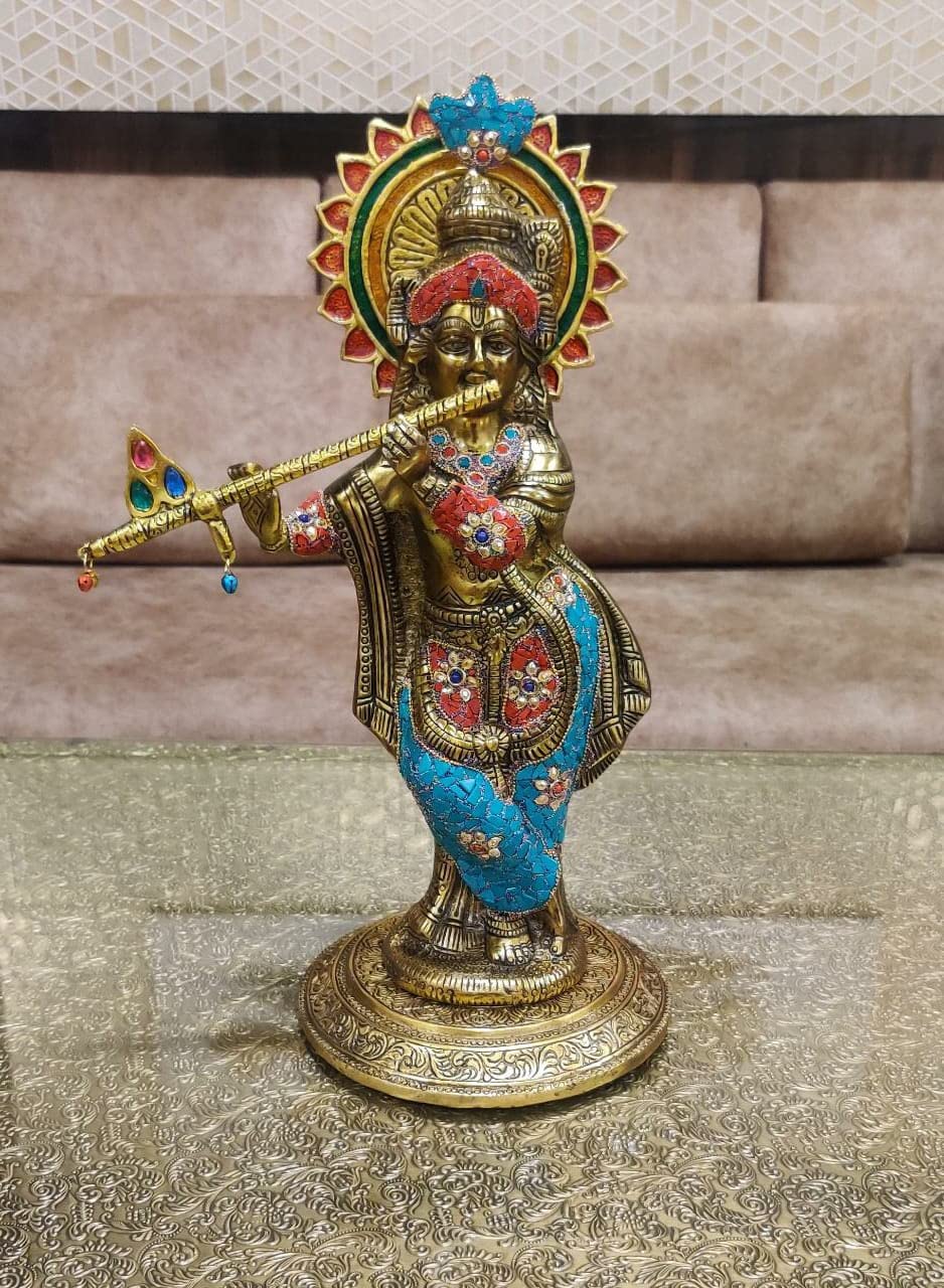Enlighten your home with this decorative piece having Lord idols made from Metal which reflects the artistic brilliance and adds elegance to your decor. It is a new start for the new house owner and by gifting these idols you are wishing them an auspicious stay at the house. In addition to being an auspicious gift these idols and figurines can also make a good addition to the house in terms of home dcor. Lord Krishna with Flute for home decor idol is handmade decorative brass sculpture for home dcor. Gorgeous hand work and perfect showcase of Indian handicrafts. Lord krishna metal statue is handmade handcrafted items use for religious worship of hindu god & goddess. This is a beautiful antique unique & gorgeous hand work on solid metal brass figure of Hindu god krishan. Bless your place and enlighten the beauty and spirituality of your house or work place with this handmade bhagwan kirshan Sculpture.