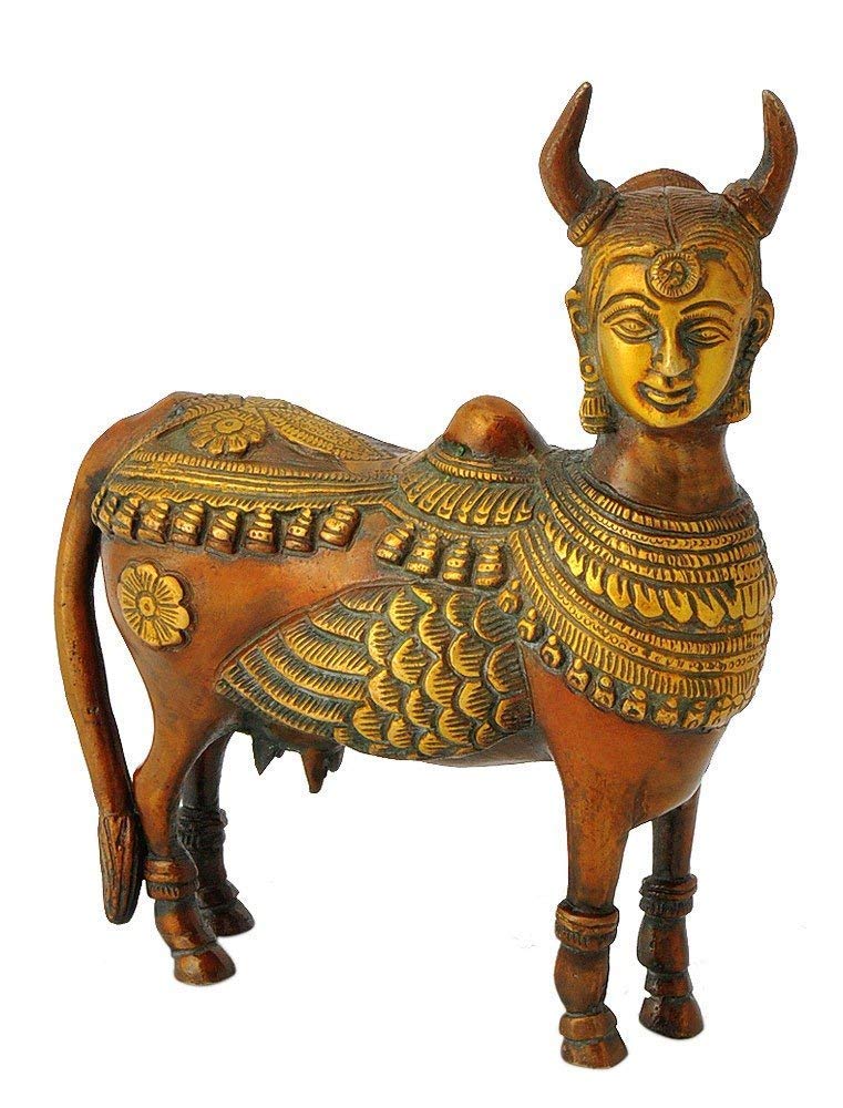 Kamadhenu also known as Surabhi is a divine bovine-goddess described in vedic scriptures as the mother of all cows. She is a miraculous "cow of plenty" who provides her owner whatever he desires and is often portrayed as the mother of other cattle as well as the eleven Rudras. In iconography she is generally depicted as a white cow with a female head and breasts or as a white cow containing various deities within her body. All cows are venerated in Hinduism as the earthly embodiment of the Kamadhenu. As such Kamadhenu is not worshipped independently as a goddess and temples are not dedicated to her honor alone; rather she is honored by the veneration of cows in general throughout the observant Indian population.