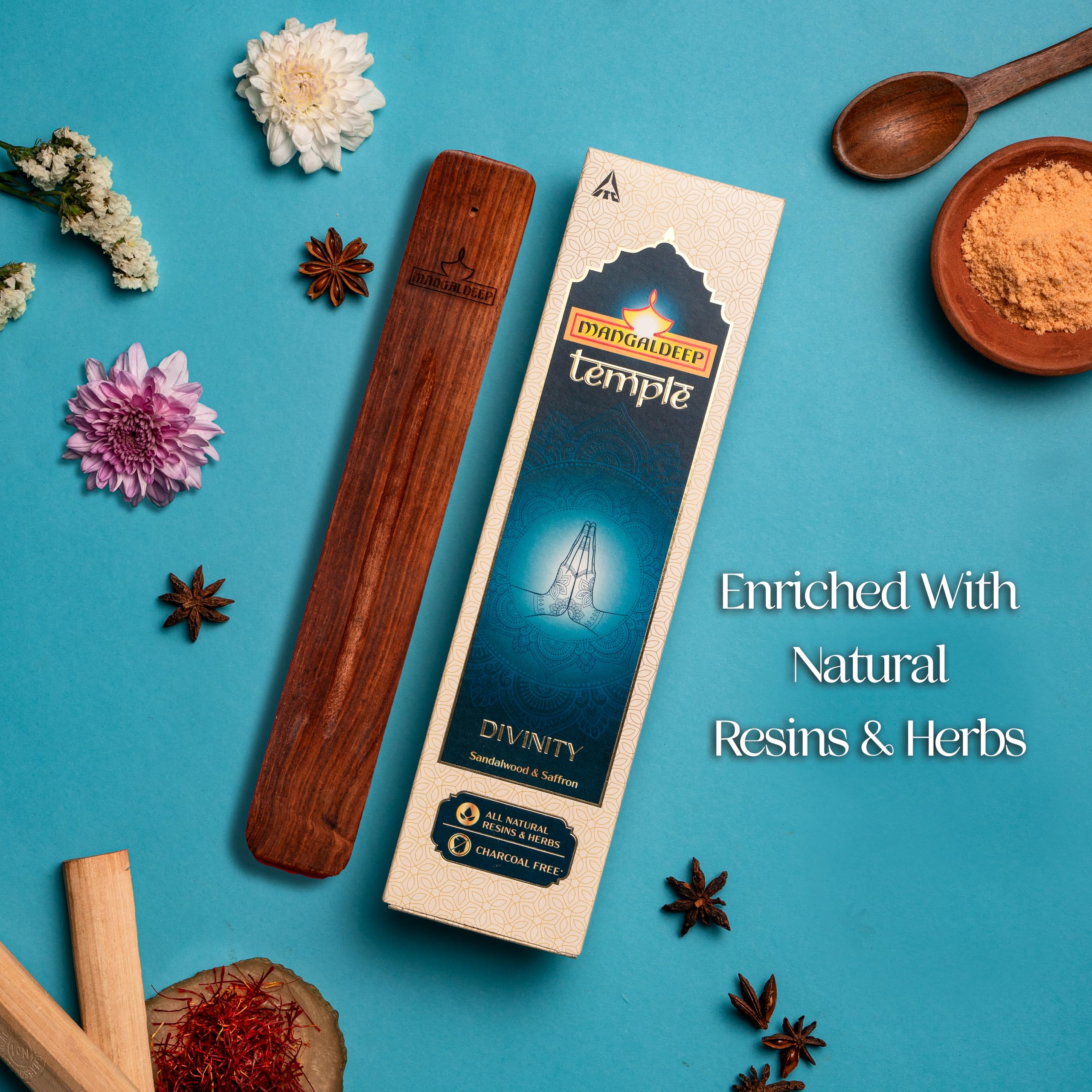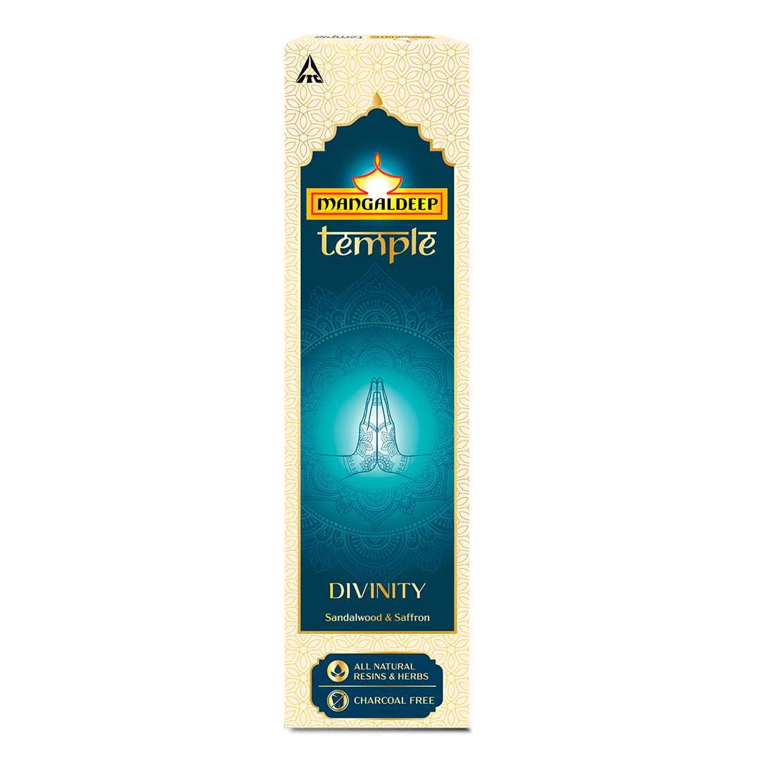 Mangaldeep Temple Divinity Sandalwood & Saffron Agarbatti offers a celestial fragrance experience ideal for enriching your spiritual practices at home. This incense is a tribute to traditional temple worship crafted to create an atmosphere filled with aura positivity and divinity. Infused with an exquisite blend of sandalwood saffron cinnamon and white musk it envelops your space in an aroma that is both uplifting and purifying.