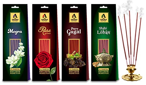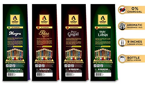Scent:Mogra Rose Gugal & LobanThe Aroma Factory Mogra Rose Gugal & Loban Agarbatti {& } (Pack of 4 x 30 sticks) Experience the Soothing Scent of Exclusive Incense Sticks Agarbatti by The Aroma Factory - A Quality product by Panjon Limited. . Made with Natural Essential Oils and Content indulge in the Soothing Aroma of Incense Sticks by The Aroma Factory. Try all fragrances of Agarbatti and Dhoop Batti by The Aroma Factory : Chandan Loban Gugal Mogra Rose Lavender White Sage Sandalwood Attar Jannat Ul Firdaus Mantra masala Chocolate Green Apple Strawberry Pineapple Jasmine.Incense Sticks Agarbatti sandalwood agarbathi agarbati dhoop dhoopbatti dhoopbati dhoop batti agarbathies incensestick incensesticks incense aroma pooja puja . Suitable for gifting : Add more aroma to your loved ones life by getting them these fragrance sticks on occasions such as Diwali Rakhi and other festive events. 100% Quality Assured.