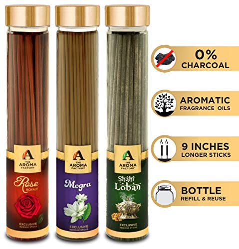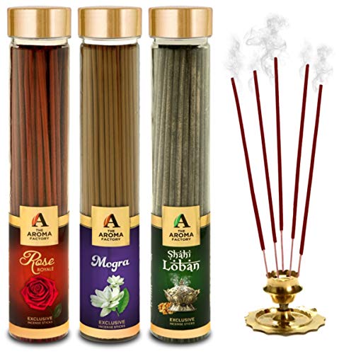 Scent:Rose Royal Mogra & LobanThe Aroma Factory Rose Royal Mogra and Loban Incense Stick Agarbatti (Zero and 100% Herbal) Bottle Pack of 3 x 100 Experience the Soothing Scent of Exclusive Incense Sticks Agarbatti by The Aroma Factory - A Quality product by Panjon Limited. . Made with Natural Essential Oils and Content indulge in the Soothing Aroma of Incense Sticks by The Aroma Factory. Try all fragrances of Agarbatti and Dhoop Batti by The Aroma Factory : Incense Sticks Agarbatti sandalwood agarbathi agarbati dhoop dhoopbatti dhoopbati dhoop batti agarbathies incense stick incense sticks aroma pooja puja . Suitable for gifting : Add more aroma to your loved ones life by getting them these fragrance sticks on occasions such as Diwali Rakhi and other festive events. 100% Quality Assured.