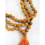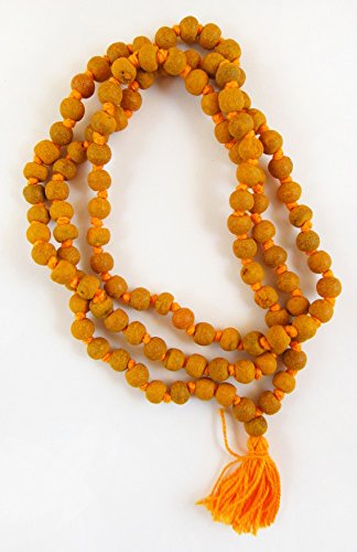 7mm Knotted Hand-Carved Haldi Turmeric Root Mala with Orange Floss Tassel measures 34" long plus 1.5" tassel. Our Haldi Turmeric Mala is naturally aromatic as carved from genuine turmeric root. There are 108 beads strand with a knot between each bead. You may be familiar with turmeric as a cooking spice and as a medicinal/antioxidant for health. In Ayurvedic medicine Haldi is considered one of the most purifying herbs. It is used for recitation of mantras for success with calming conflict. Haldi malas are used for Anusthan (special prayers). It is associated with fertility. This mala was assembled by hand from natural materials so bead sizes may vary. *Attention* This mala is carved from natural turmeric root and will stain your skin and clothing yellow when handled and worn especially when new. Many people prefer to keep it on their altar.